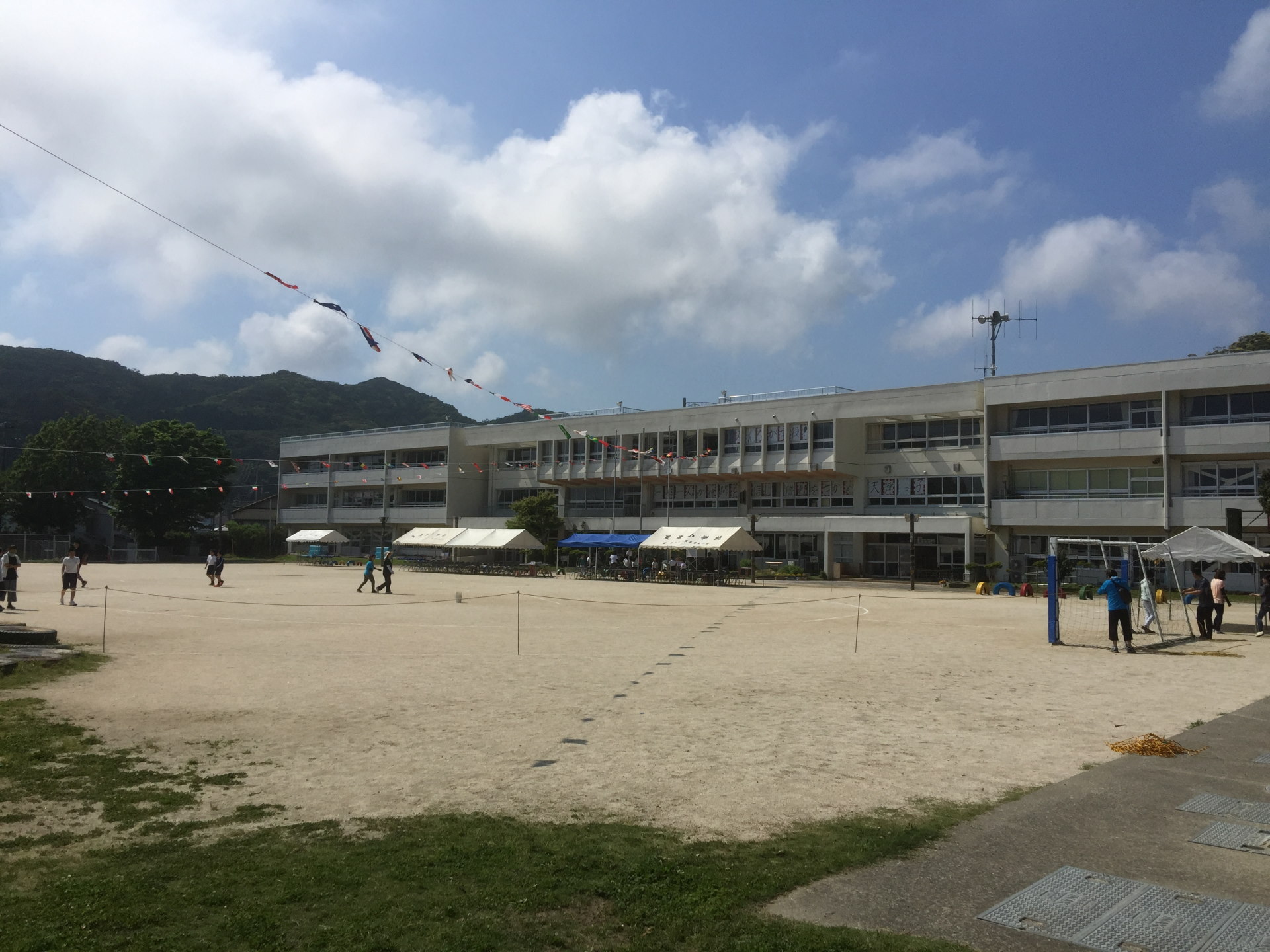 PTAの役員さんをはじめ、父兄が集まり、テントの設営や万国旗、ローピングなどの準備を進めていく。