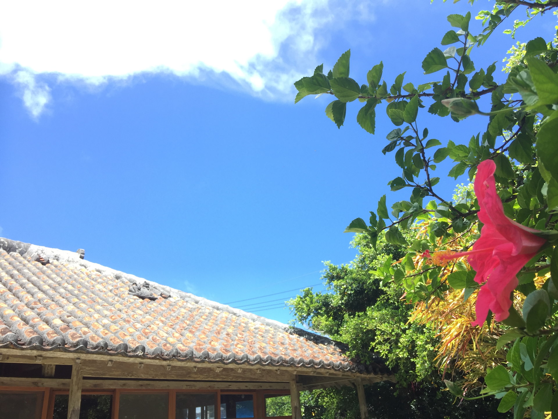 [写真:「てぃーらぶい」の屋根とハイビスカスと青空