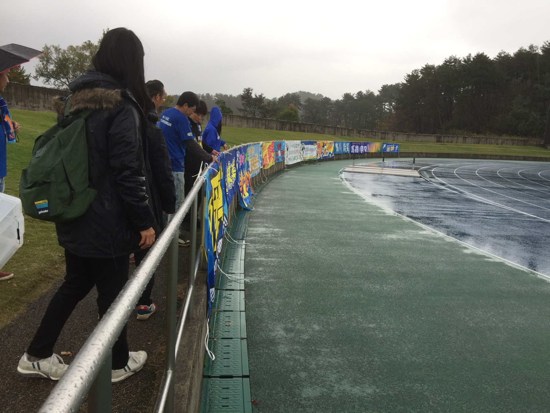 [写真:雨の中、サポーターの方々と協力して横断幕を掲出