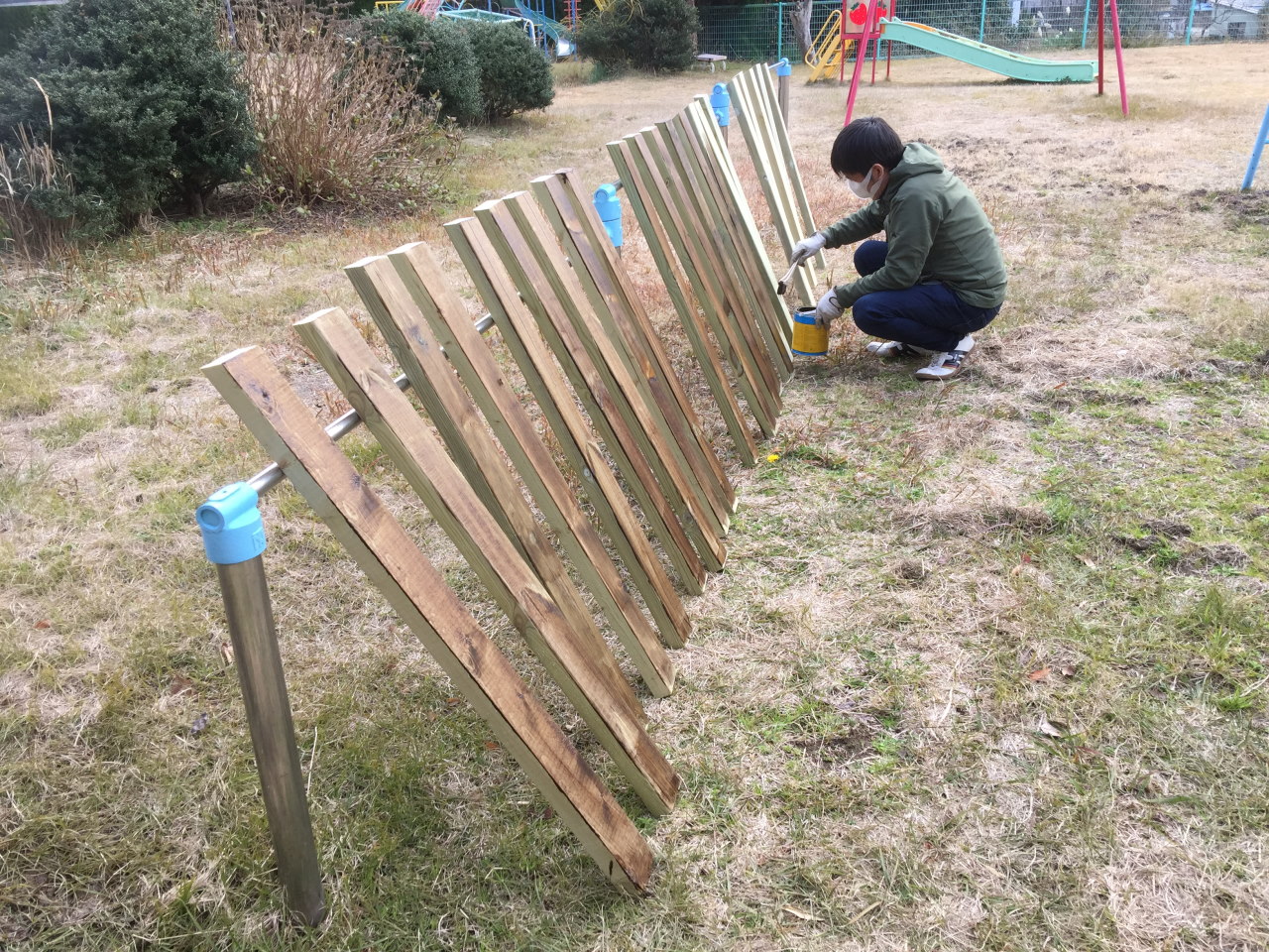 まずはカットした木材に防腐剤を塗布していく。