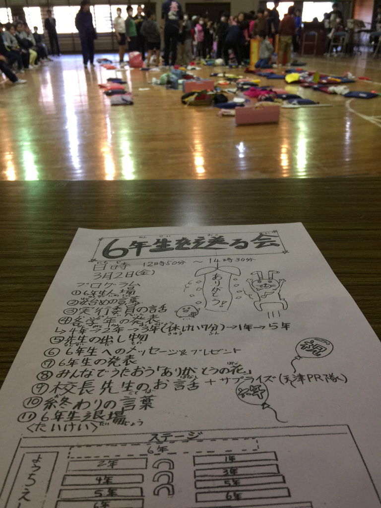 終盤、校長先生のお話しの後、サプライズで6年生が創り上げた天津PRビデオが上映される。