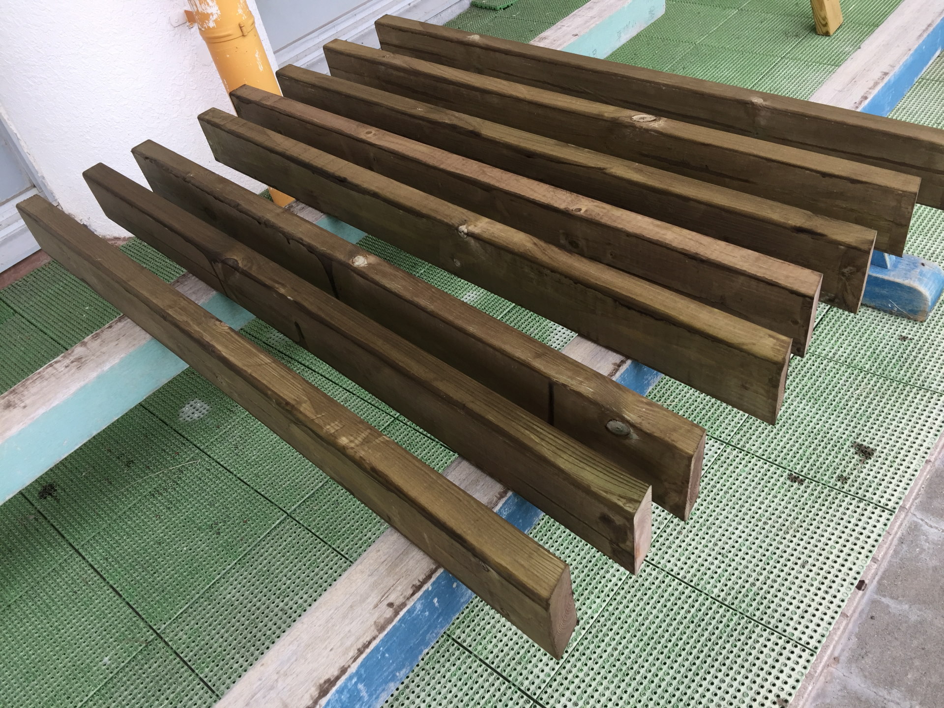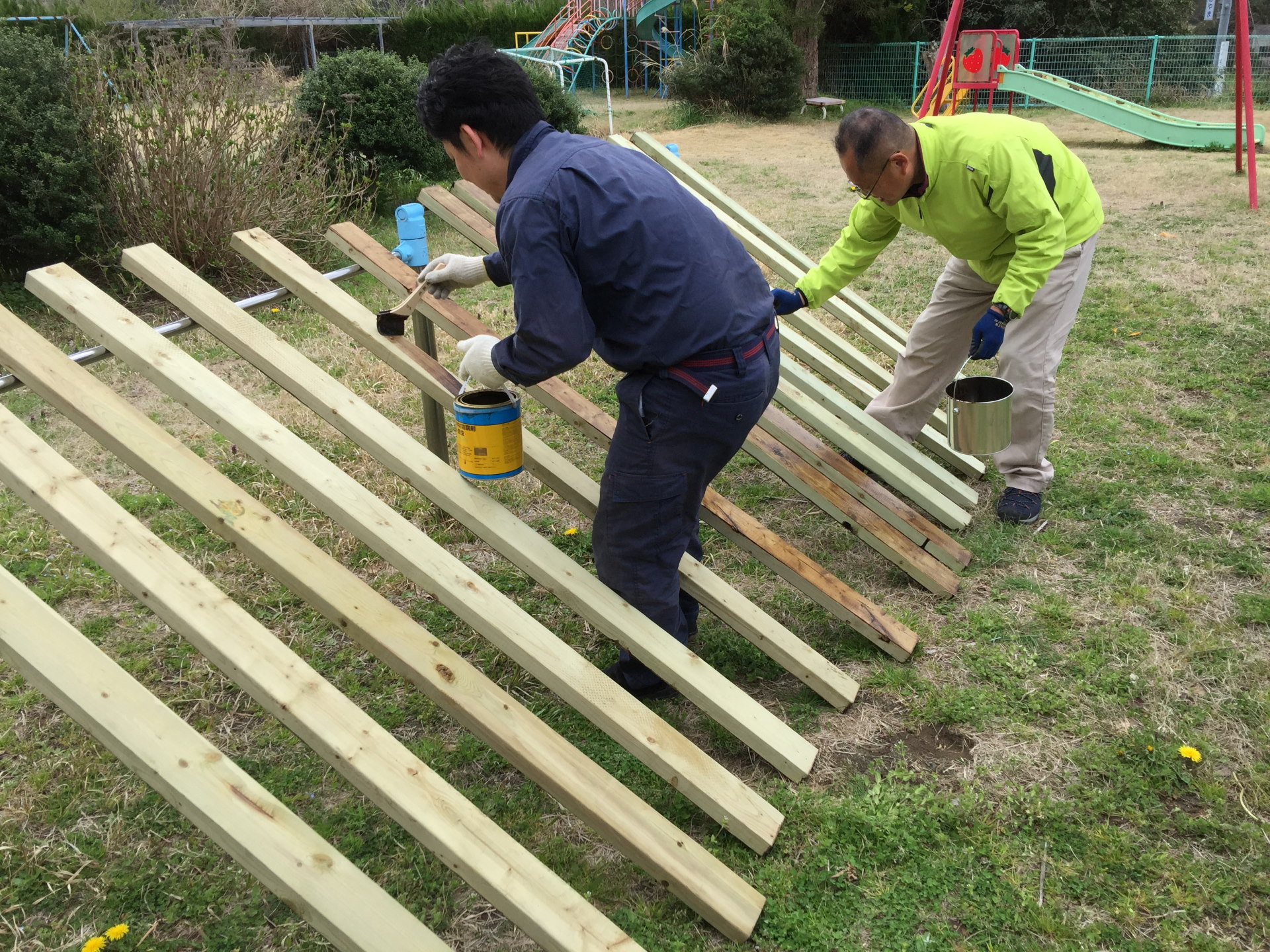 [写真:脚の着地部を防腐塗料にドブ漬けしてさらにコーティング