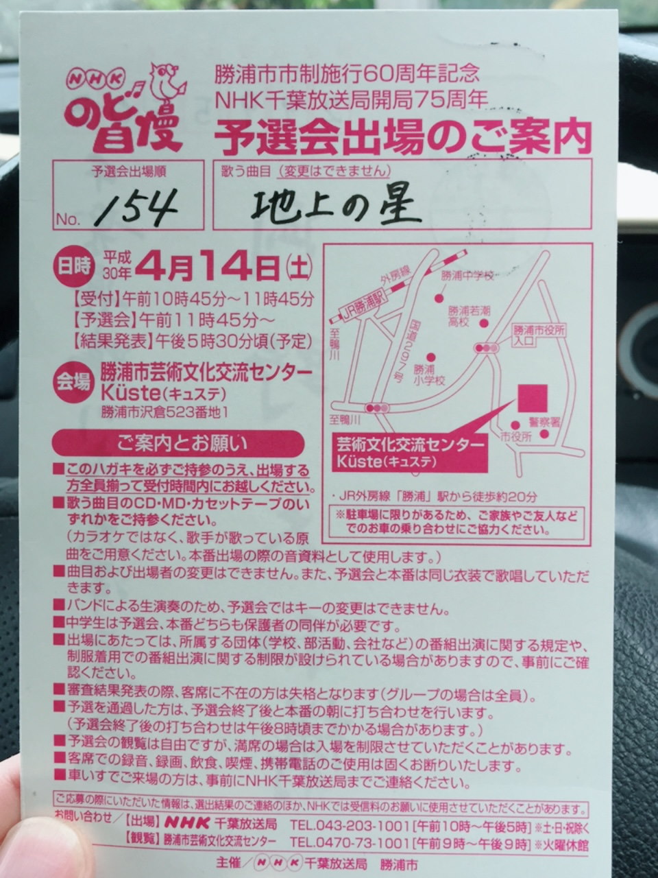 前回は「千の風になって」で応募したのだが、千の風になってはサビが後の方なので、30秒程度しか歌えない予選会では不利だろうという分析で今回は自分の大好きで、最初から全力で歌える「地上の星」を選択した。