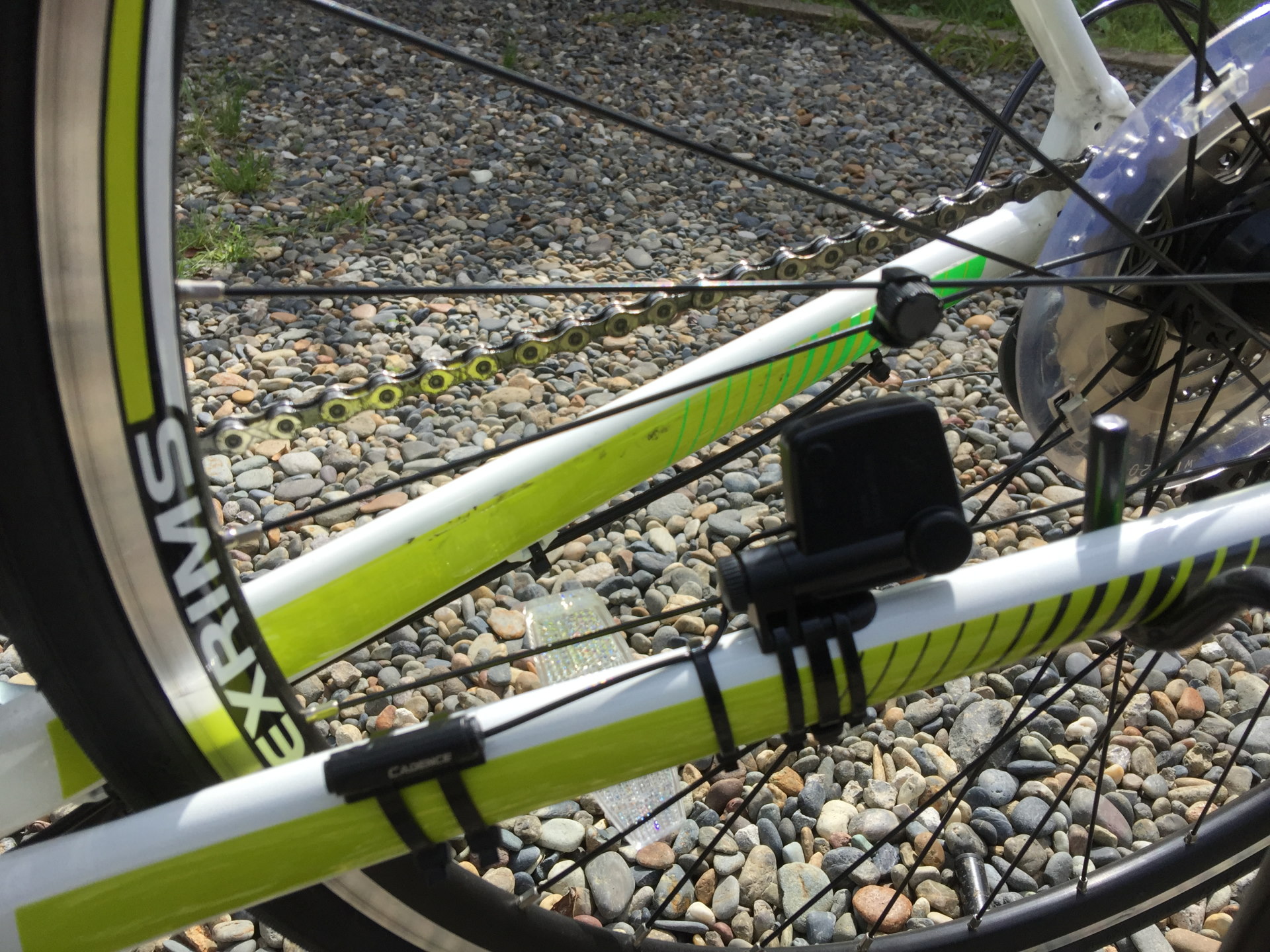 [写真:ワイヤレス型。センサーは後輪に装着。ペダルの回転数(ケイデンス)も測定できる。なんと心拍モニターもある。