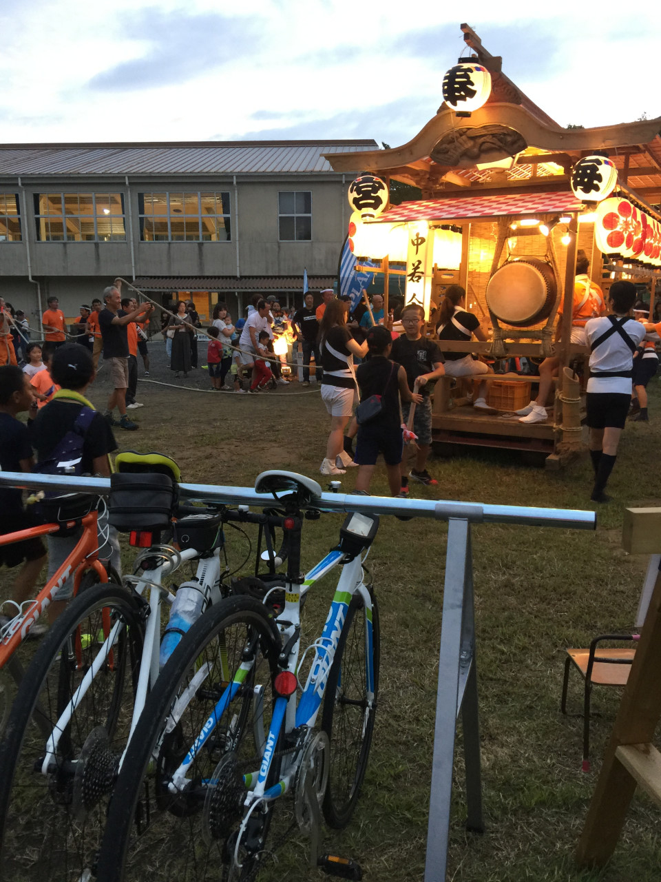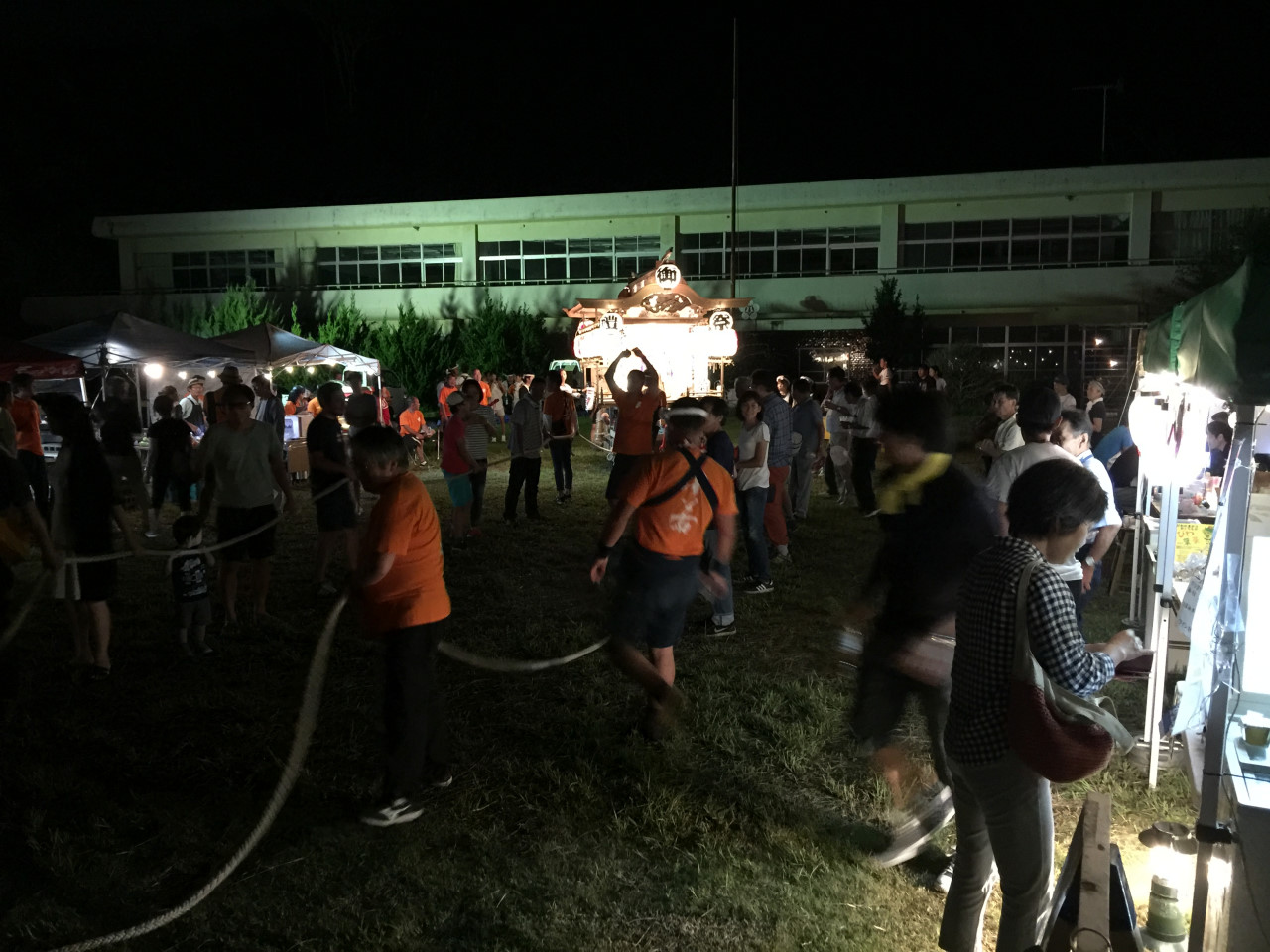校庭には地元のお店が並び、また町内からは山車も出て、午後8時前までひっきりなしに囃子太鼓を奏でていた。(考えてみれば、数時間続けて奏でるわけだから、交代交代とは言え、たいへんだったと思う)