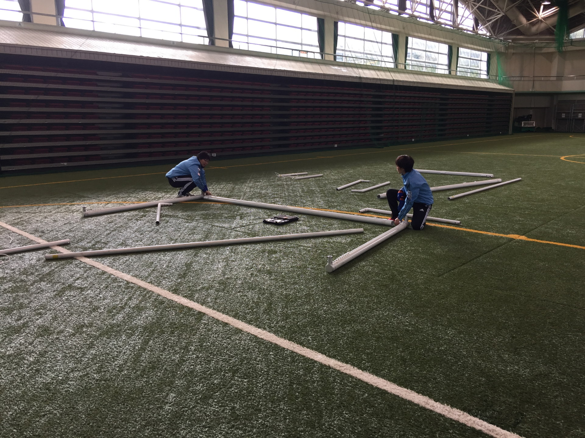 お昼前、選手たちも東京から到着し、ボランティアも集まって、さっそくサイドフェンスを設営し、練習会場づくりが行われた。