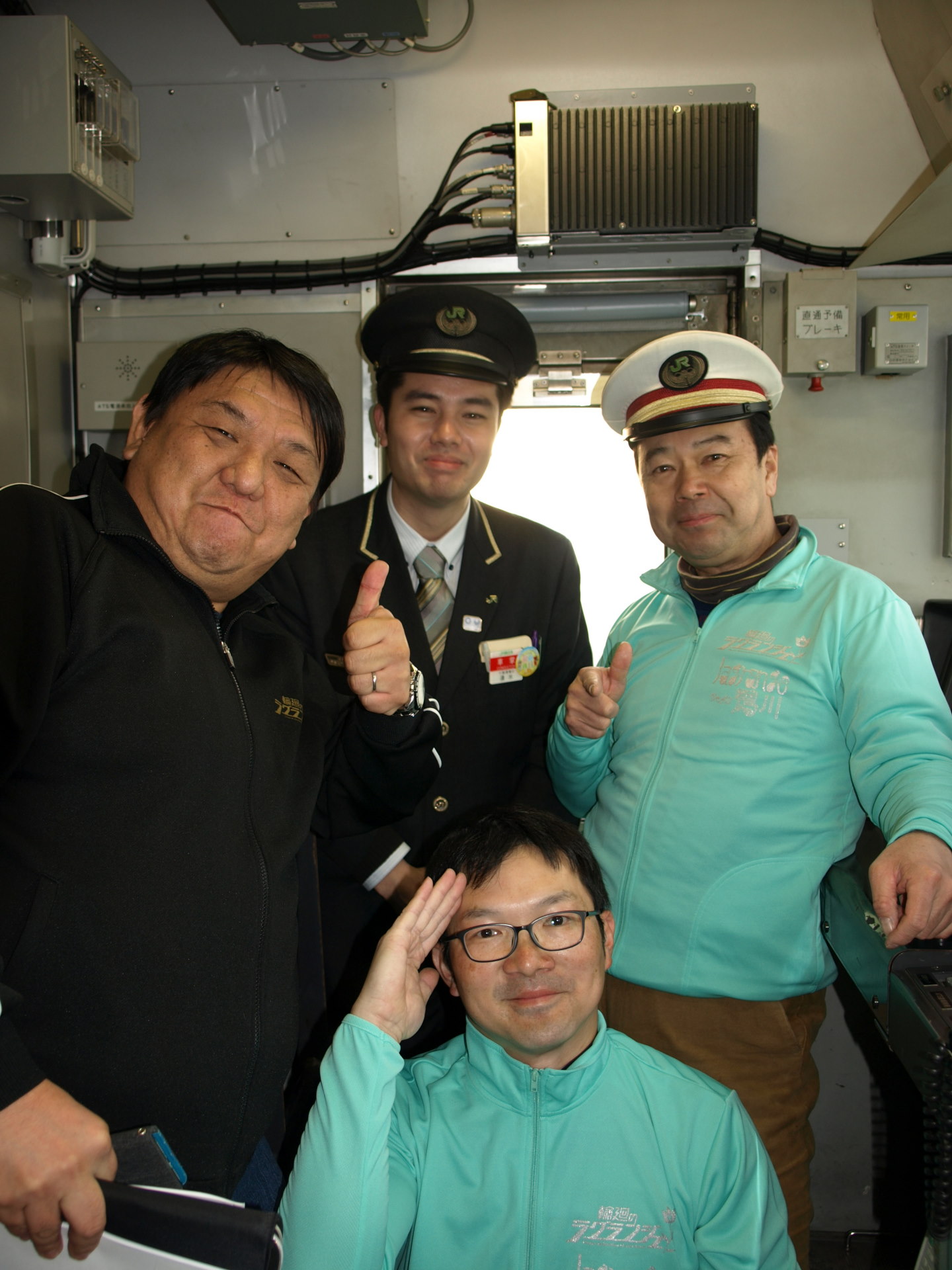[写真:車掌室にてJRの車掌さん、諏訪P、千野Pと…!(JR東日本の全面協力で実現したイベントでもある。感謝!)
