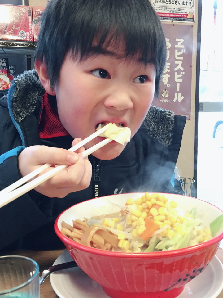 味噌ラーメンをおいしそうに頬張るミッキー。