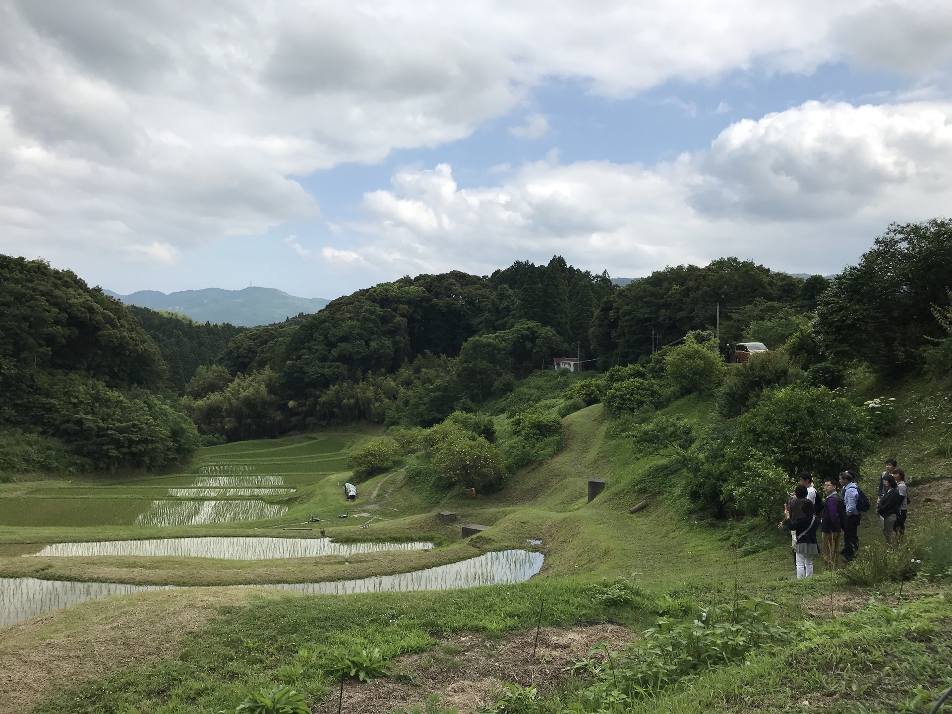 下郷さんのガイドにより、釜沼集落における棚田トラストの取組みや炭焼き小屋を1時間ほどにわたって案内いただく。早苗たなびく棚田に山々の新緑、棚田のエネルギーが満ち溢れていた。
