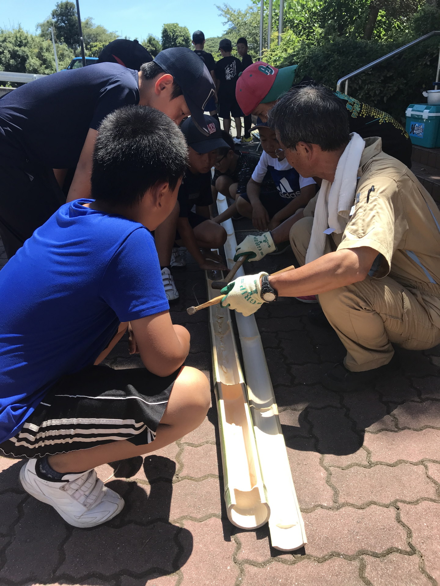 地元の農家さんのご指導により、まずは流しそうめんの道具作りに挑戦! みんな汗をかきながらも楽しそうに工作。