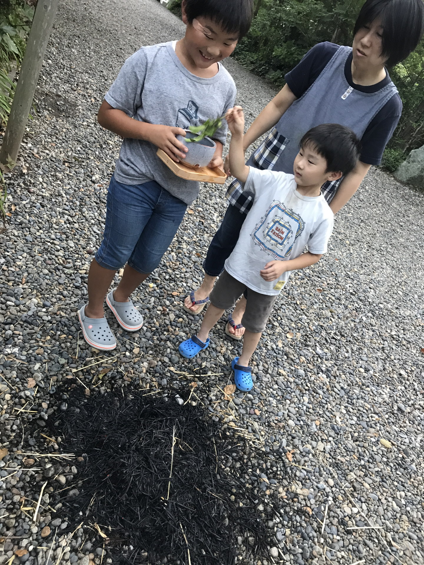 夕方、家族で送り火。ご先祖さまたちを家族みんなでお送りする。