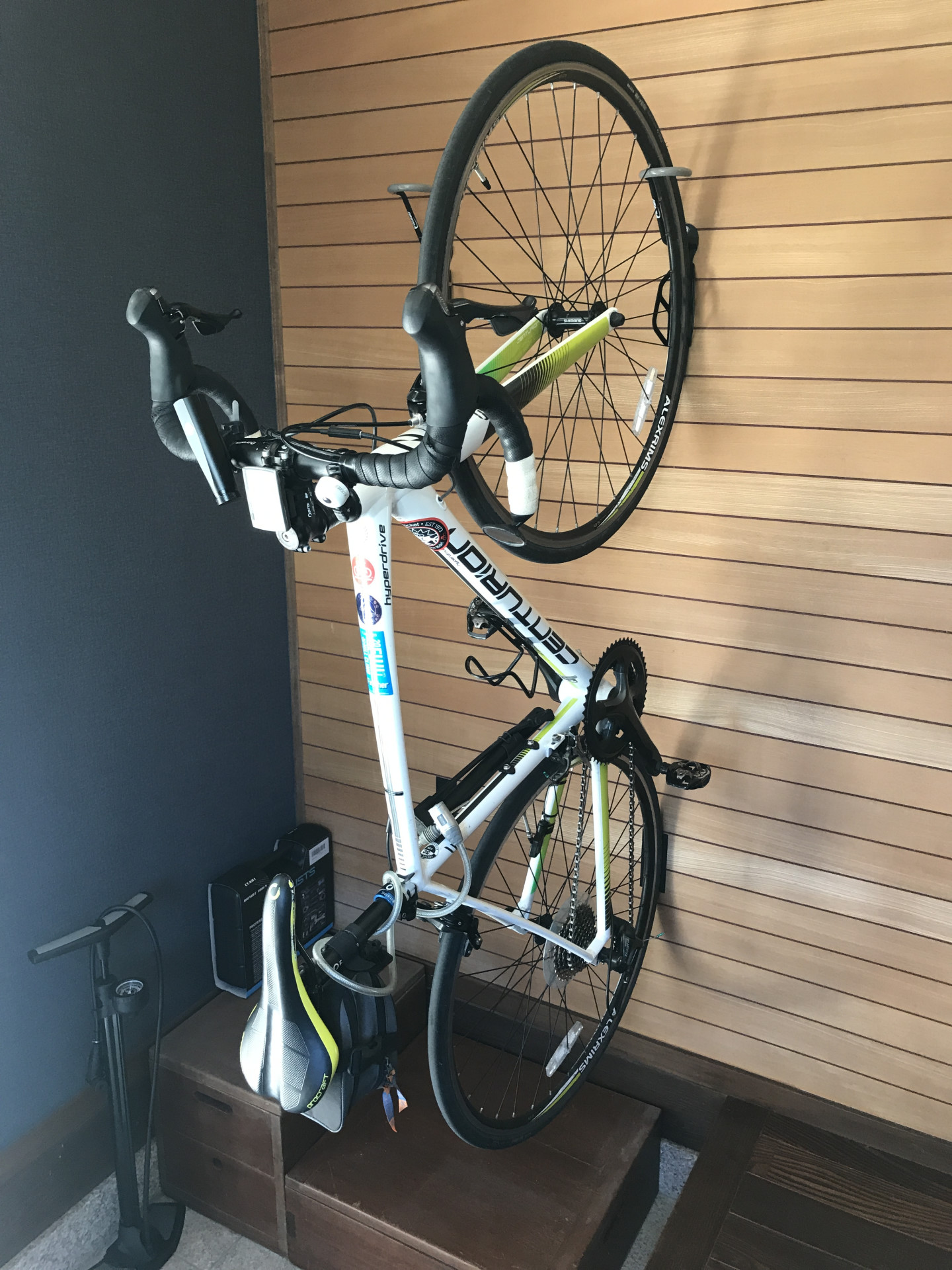 今夜サイクリストが大人数で宿坊に泊まることもあり、ずっとサボっていた壁のサイクルフックを取り付けた。(写真参照)