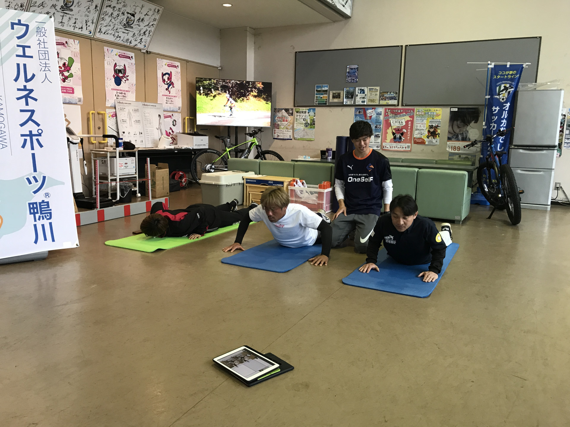 昨日と今日と、文化体育館ロビーのウェルkamoコーナーで、OneSelF社とコラボしての測定会と、トレーニング体験会を行った。