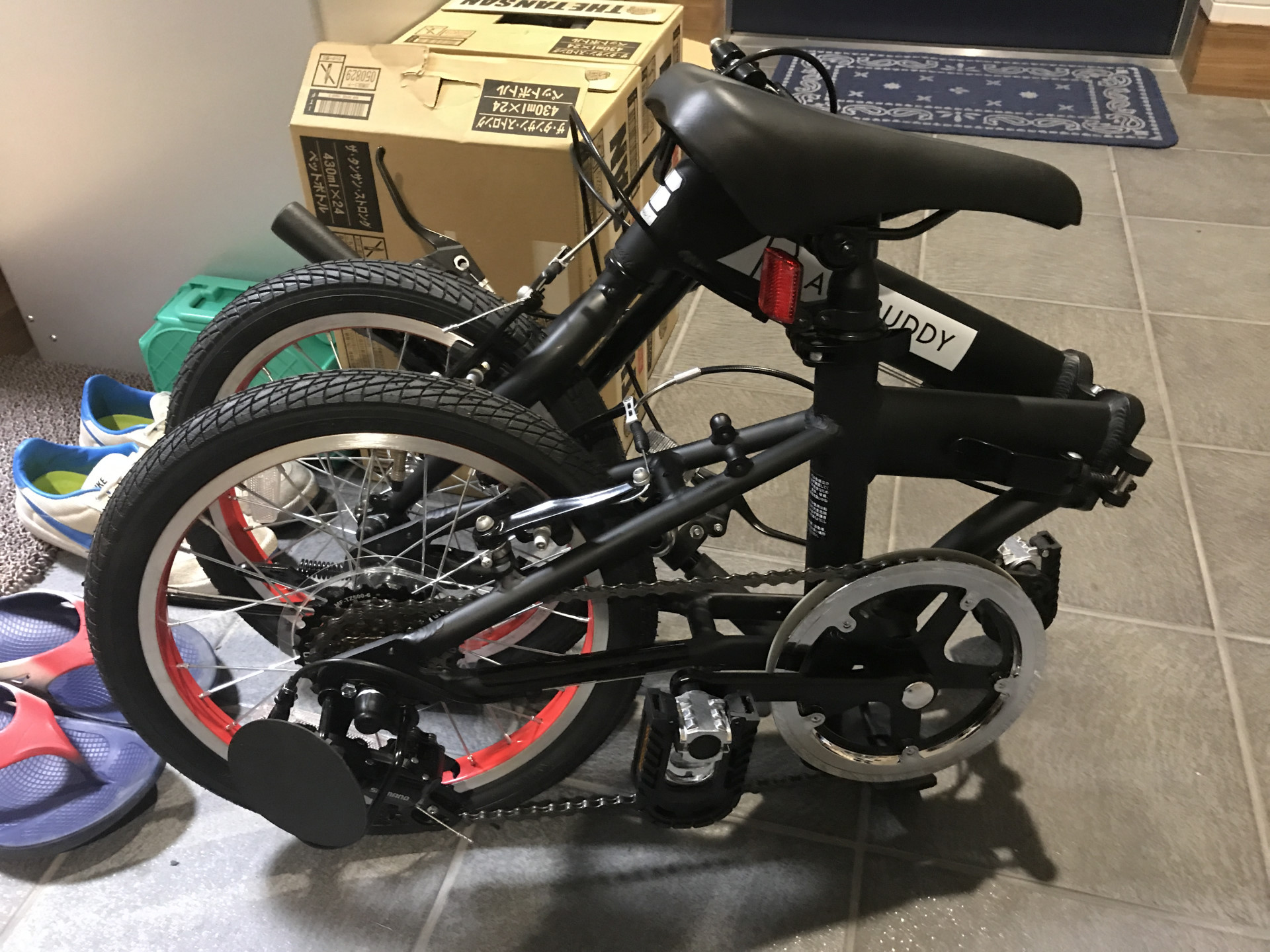 [写真:折りたたみ自転車。16,000円ほどで購入。11.5kgなのでそんなに軽くはないけど、コスパは高いかな。