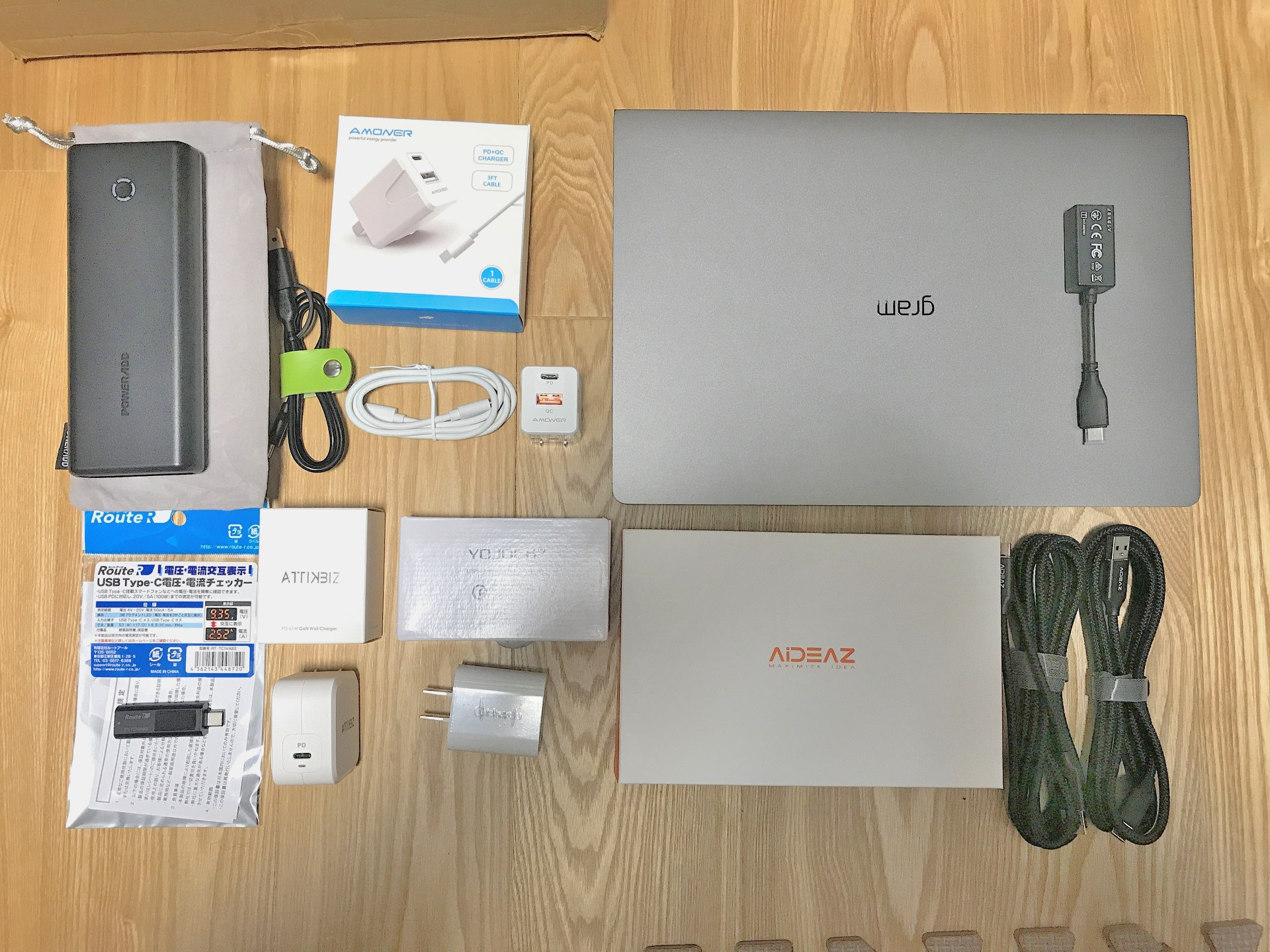 つまり、大きなACアダプタを持ち歩かなくても済む。なので、USB-Cケーブルやモバイルバッテリー(USB-Cポート搭載・PD対応)、PD対応充電器などを購入。