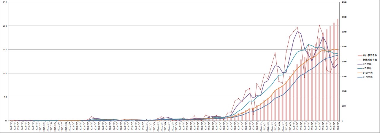 この平均線分析では、期間の短い平均線が期間の長い平均線と交差した時、トレンドが変わるサインとされている。株式相場や為替相場は実はなかなかその通りに行くばかりではないが、感染者数においては相場と比べるとトレンドは読みやすいのではないかと自分は考えており、平均線分析はある程度有効だと思う。