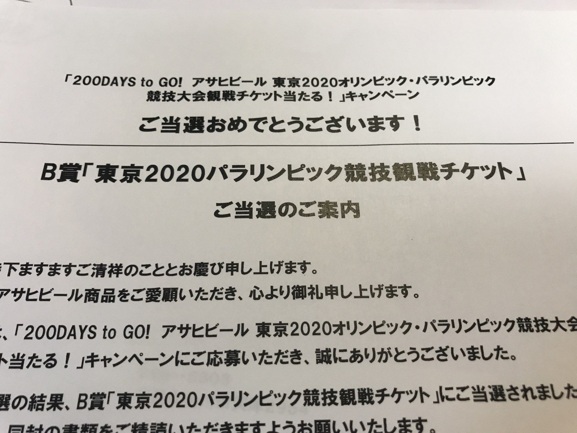 アサヒビールから来ていたのだけど、開けてみると、なんと、パラリンピック観戦チケット当選のお知らせが!