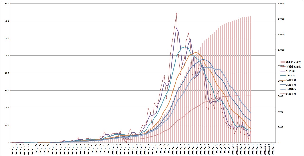 [写真:日本の感染者推移:明らかな下降トレンドになっている。平均線を見ると、おそらく4月5日以降数日間で感染した人が最も多いのではないかと推測される。緊急事態宣言は悪いタイミングではなかったかもしれない。