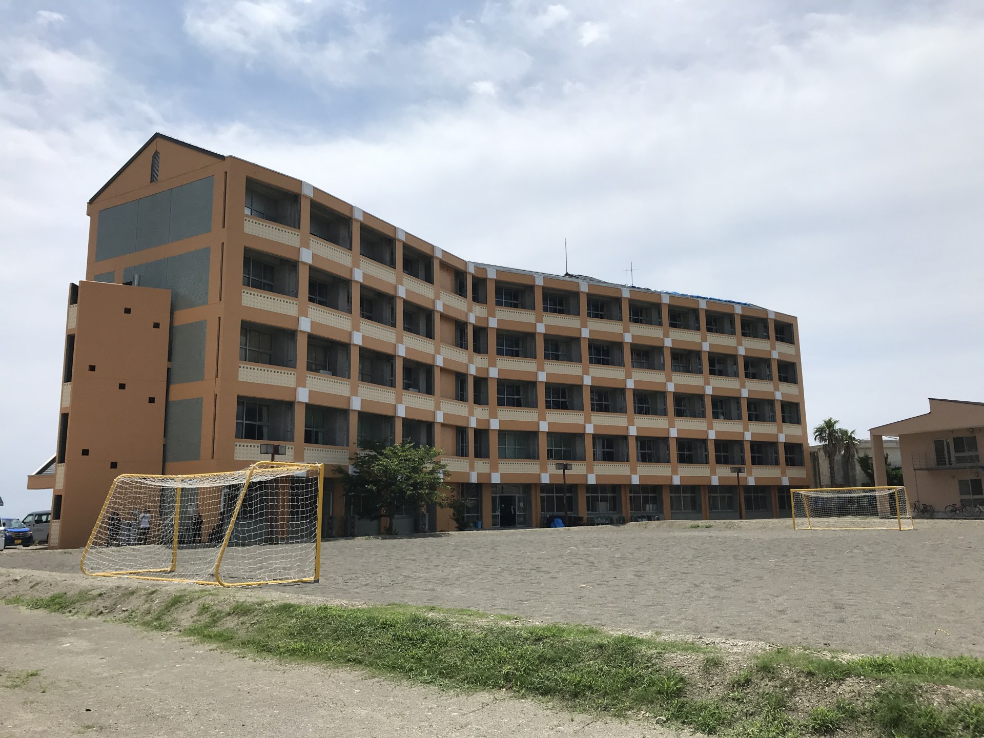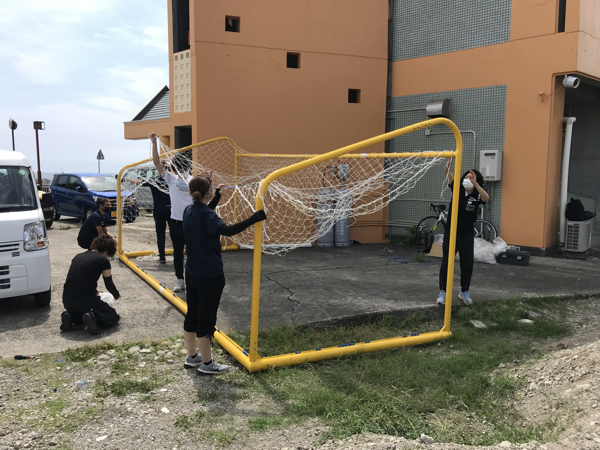 自転車でまずは鴨川令徳高校に行き、ビーチゴールの組み立てをウェルスポスタッフ総動員で行う。