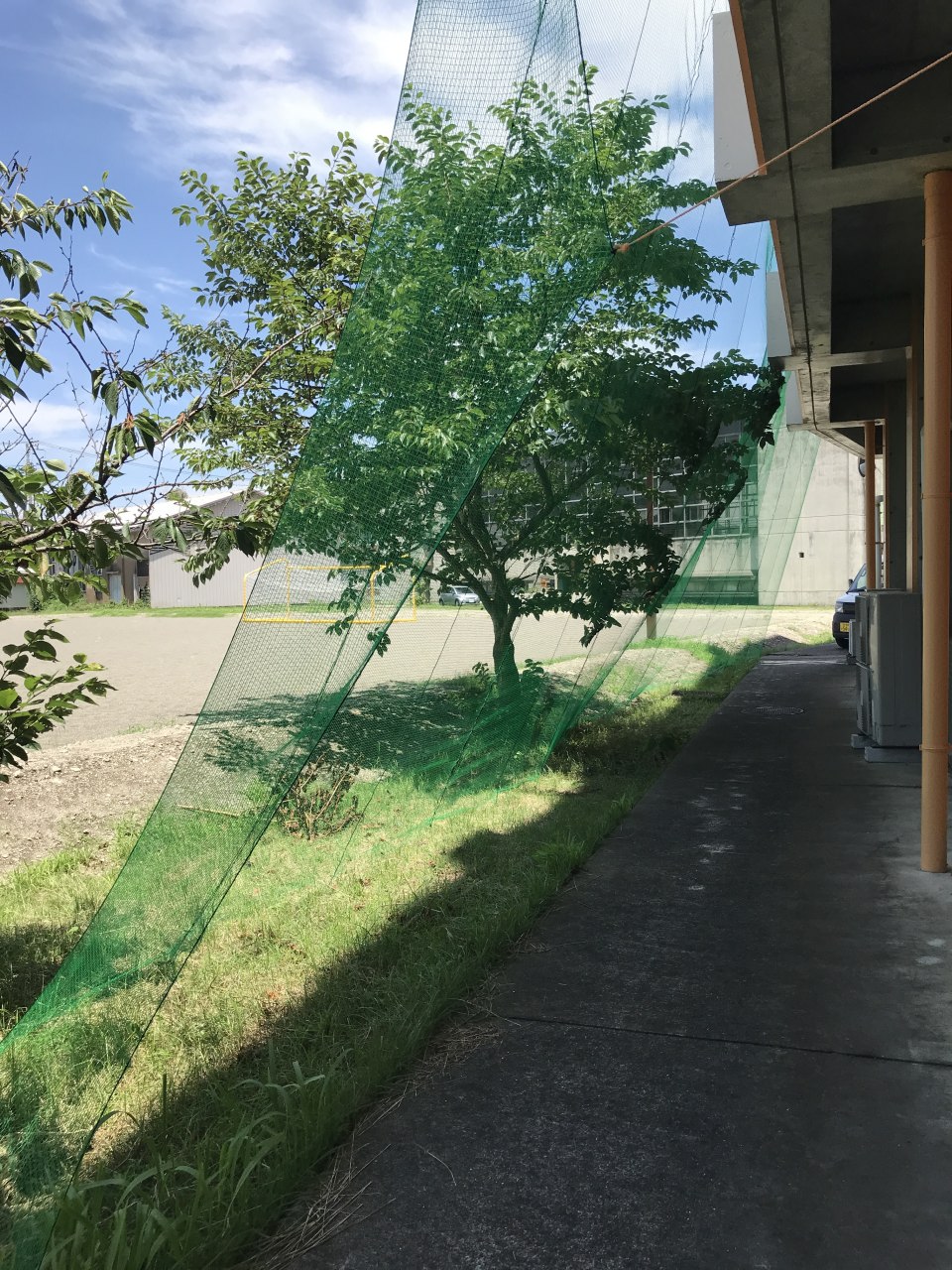 [写真:校舎の窓を保護する防球ネット