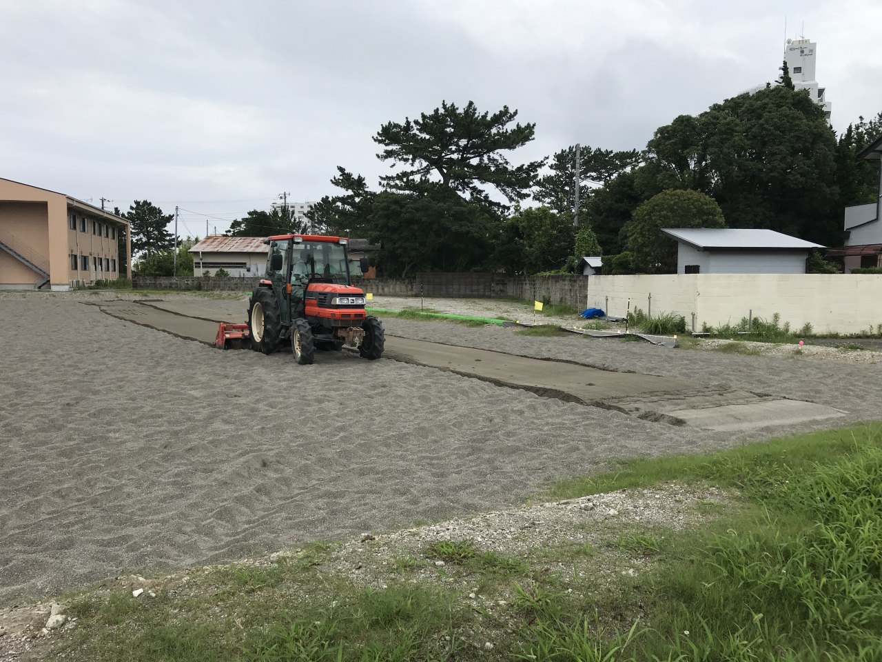 午前中、地元農家さんの協力を得て、トラクターをビーチコートに入れて砂をふかす。