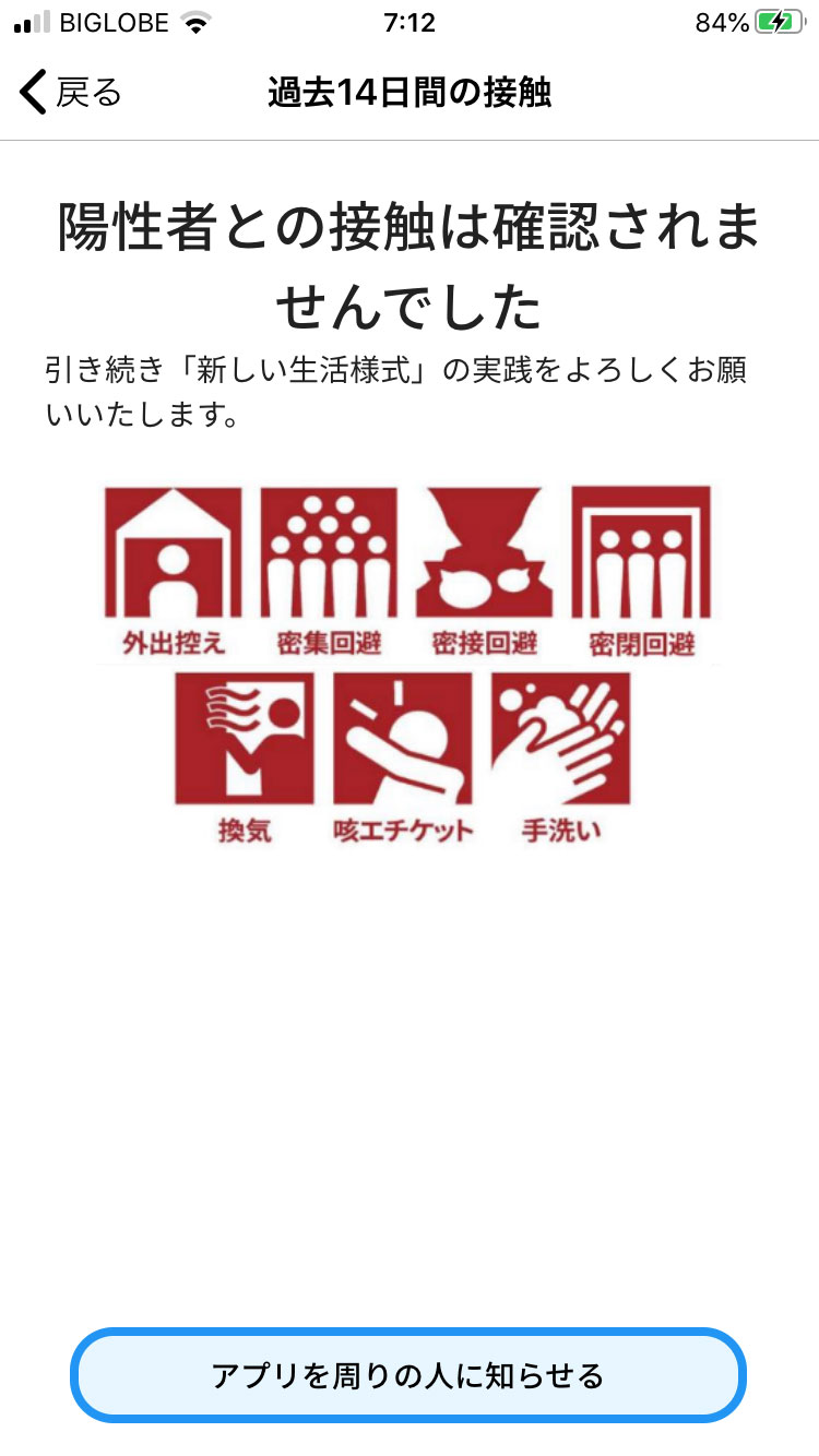 すると、「陽性者との接触は確認されませんでした」の表示(写真2枚目)
