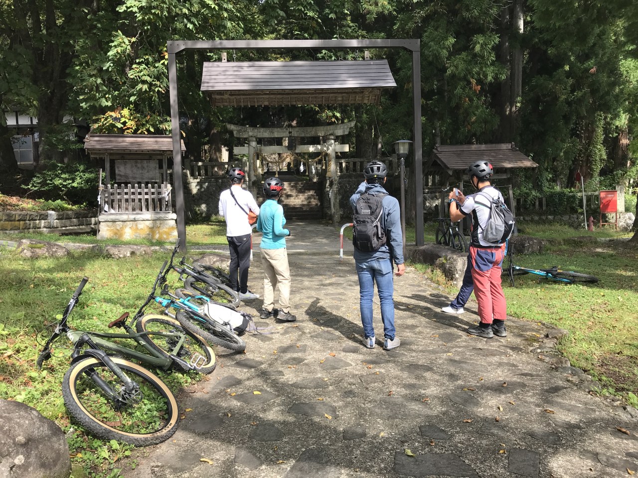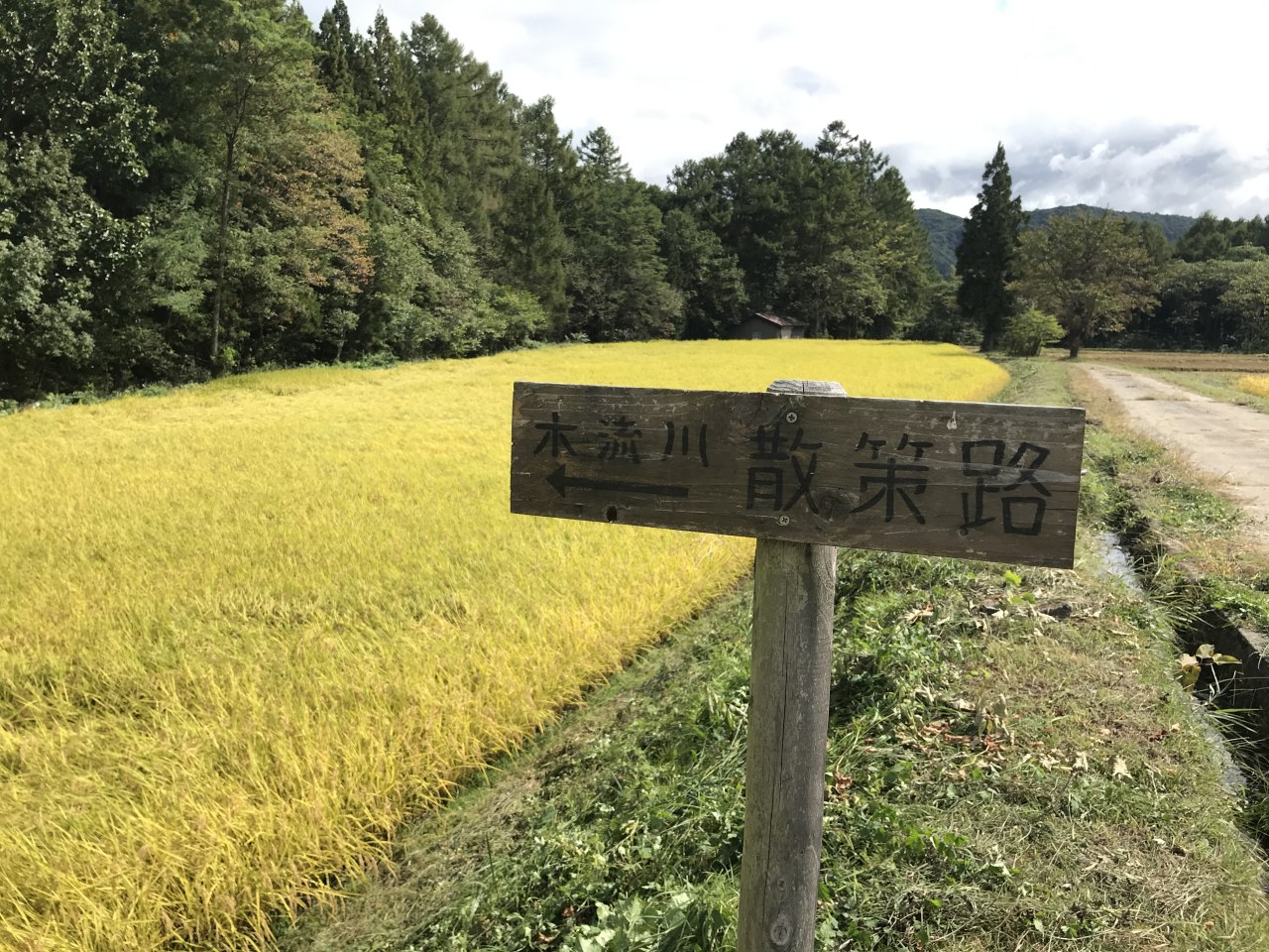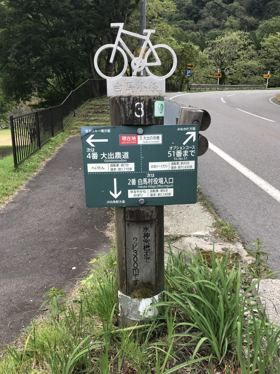 白馬村には以前より整備されてきたサイクルパス(ウォーキングも可)が縦横無尽に走っており、それらの細い道を走っていく。木立に囲まれた緑の中のオフロードを走っていくのはそれだけで楽しい。
