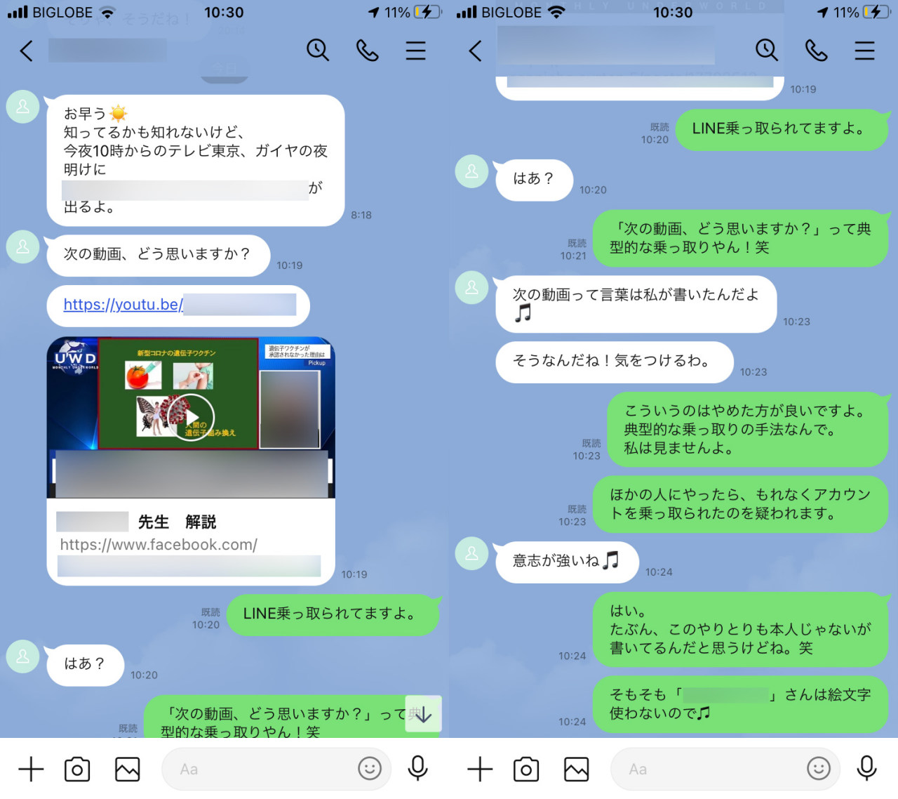 「次の動画、どう思いますか?」ってメッセージの後に動画へのリンクって、典型的なアカウント乗っ取られて送られたと思われる、スパムメッセージ…。