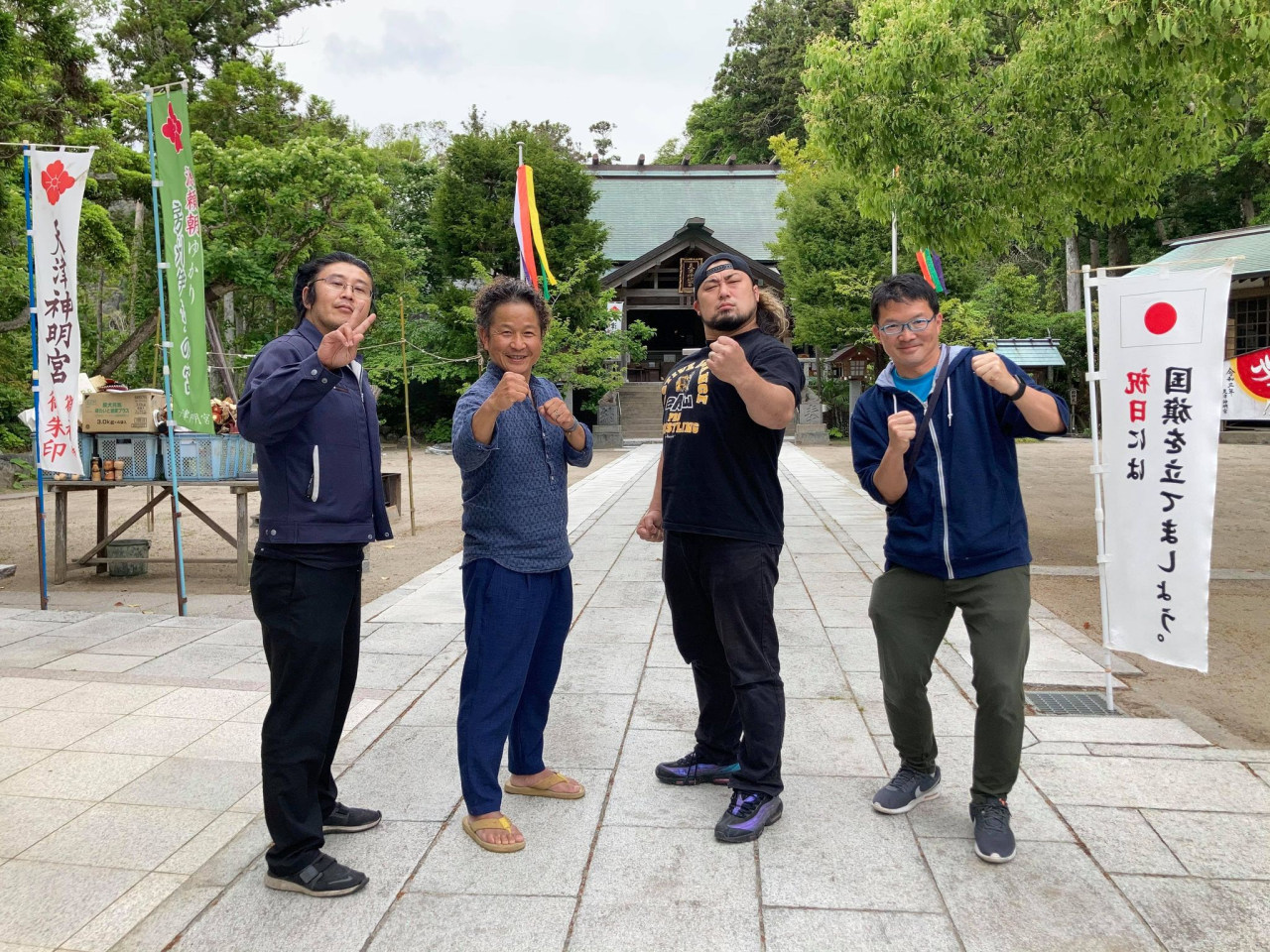 [写真:タンク永井さん、高瀬さん、高島くんと神社の前にて