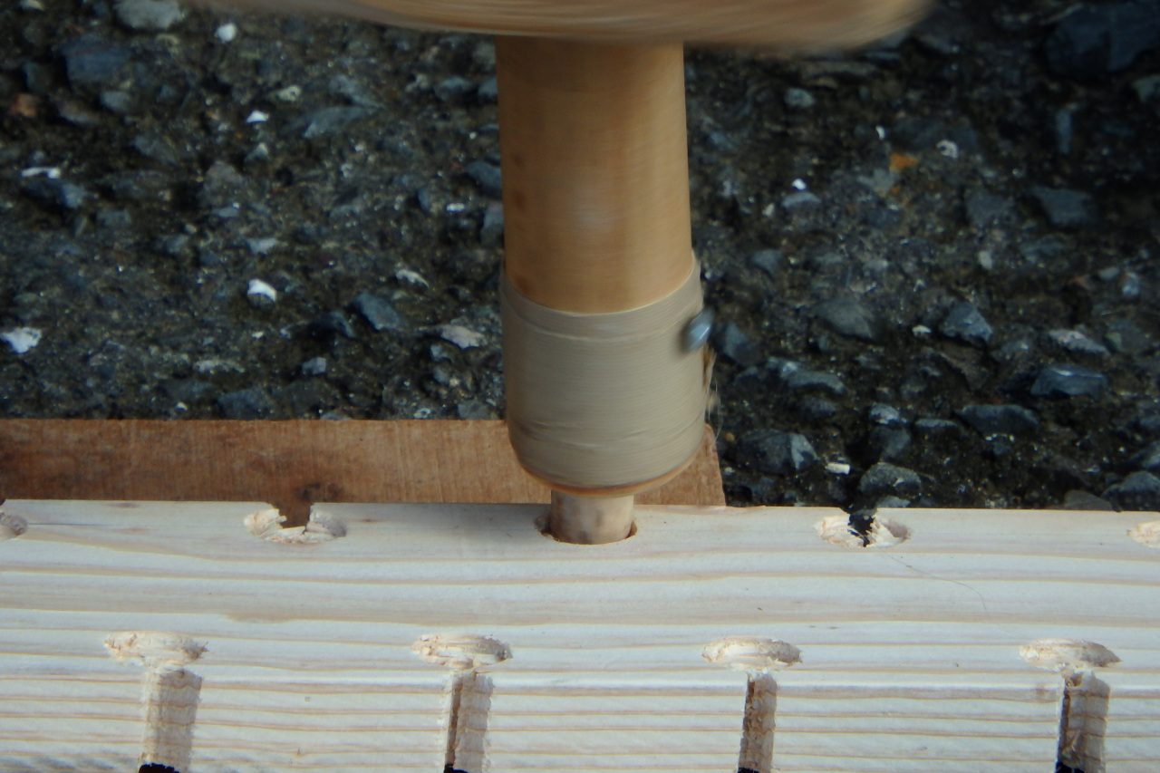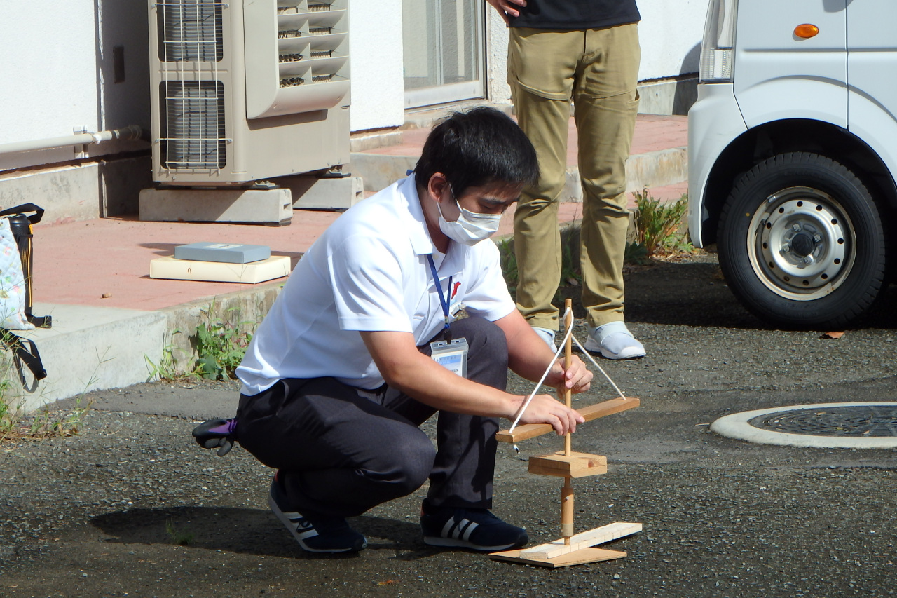 郷土資料館の方のレクチャーを受けた後、グループグループごとにわかれての弓切り式火起こしに挑戦するが、、、やはり、なかなか火は起こらない。煙が出るところまではいくが……、その先はなかなかうまくいかない……。