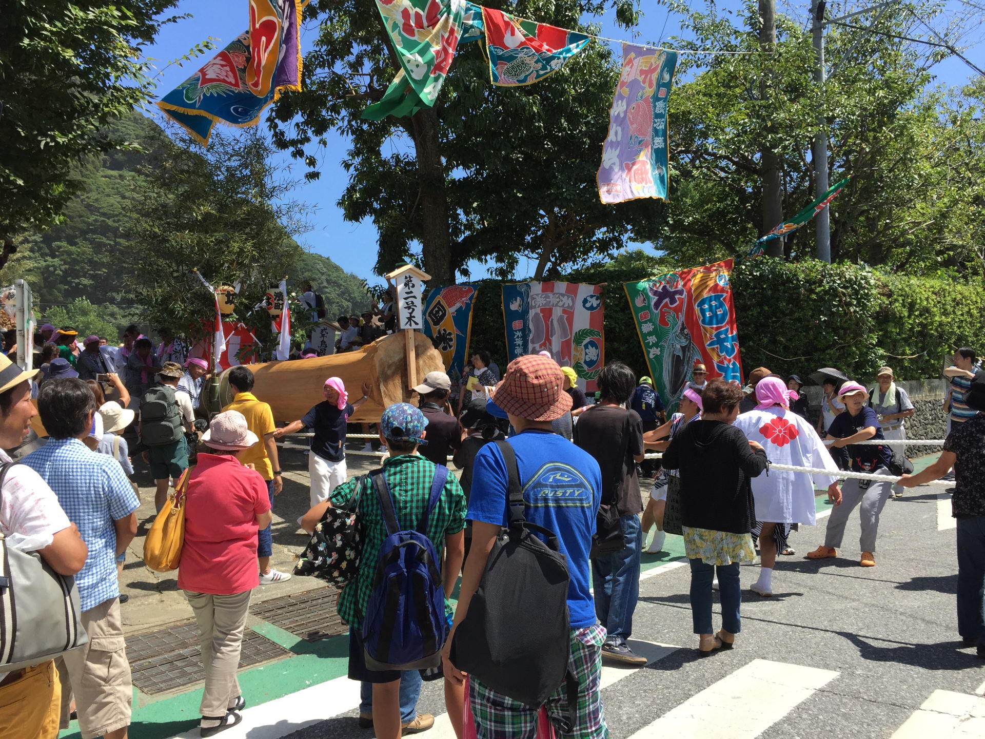 [写真:天津小学校から曵き出される御用木(2015年8月22日)