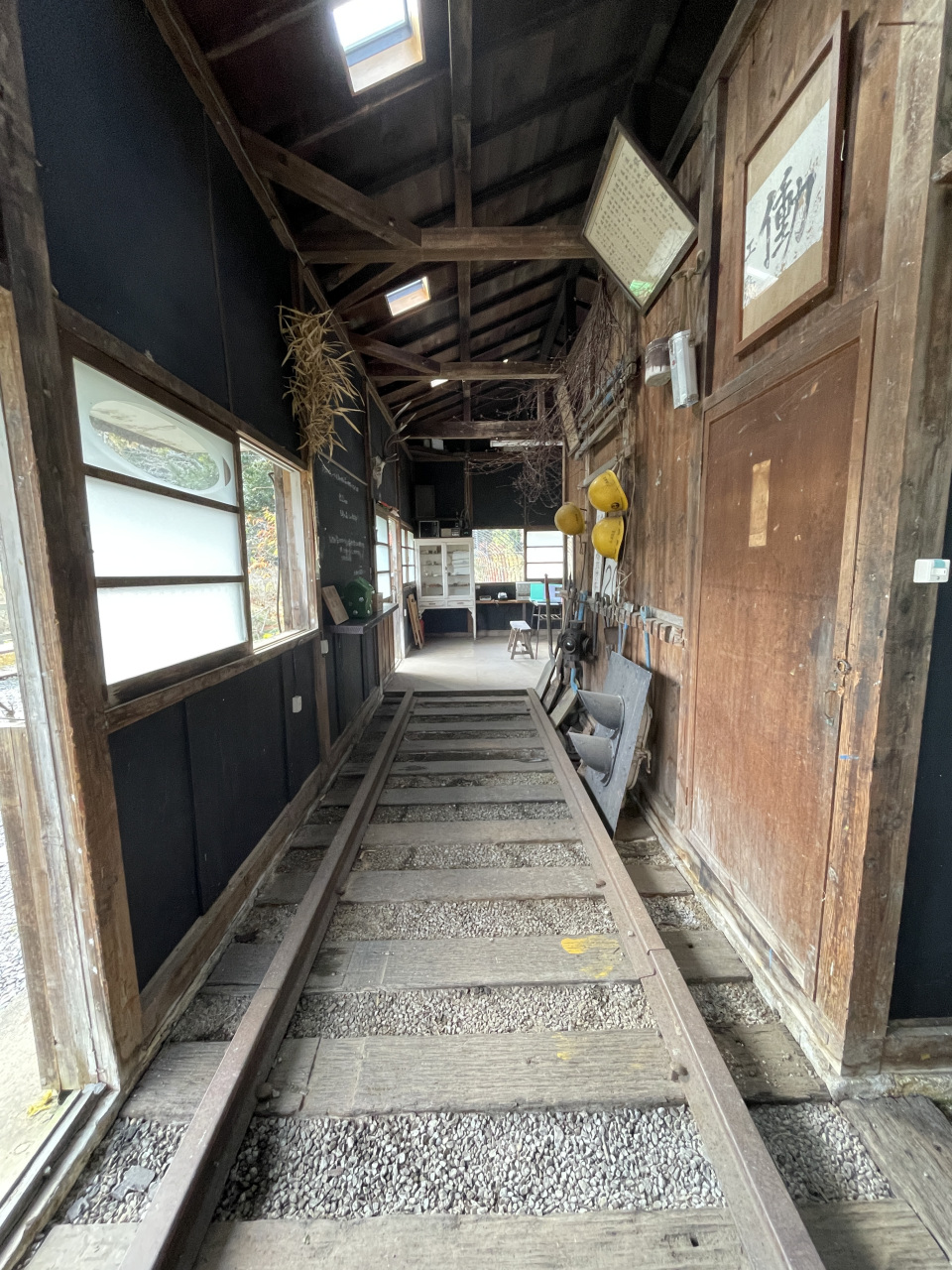 月崎駅ではアートの説明を受けた後、ちょうどやってきたトロッコ列車を見送り、ランチ休憩。