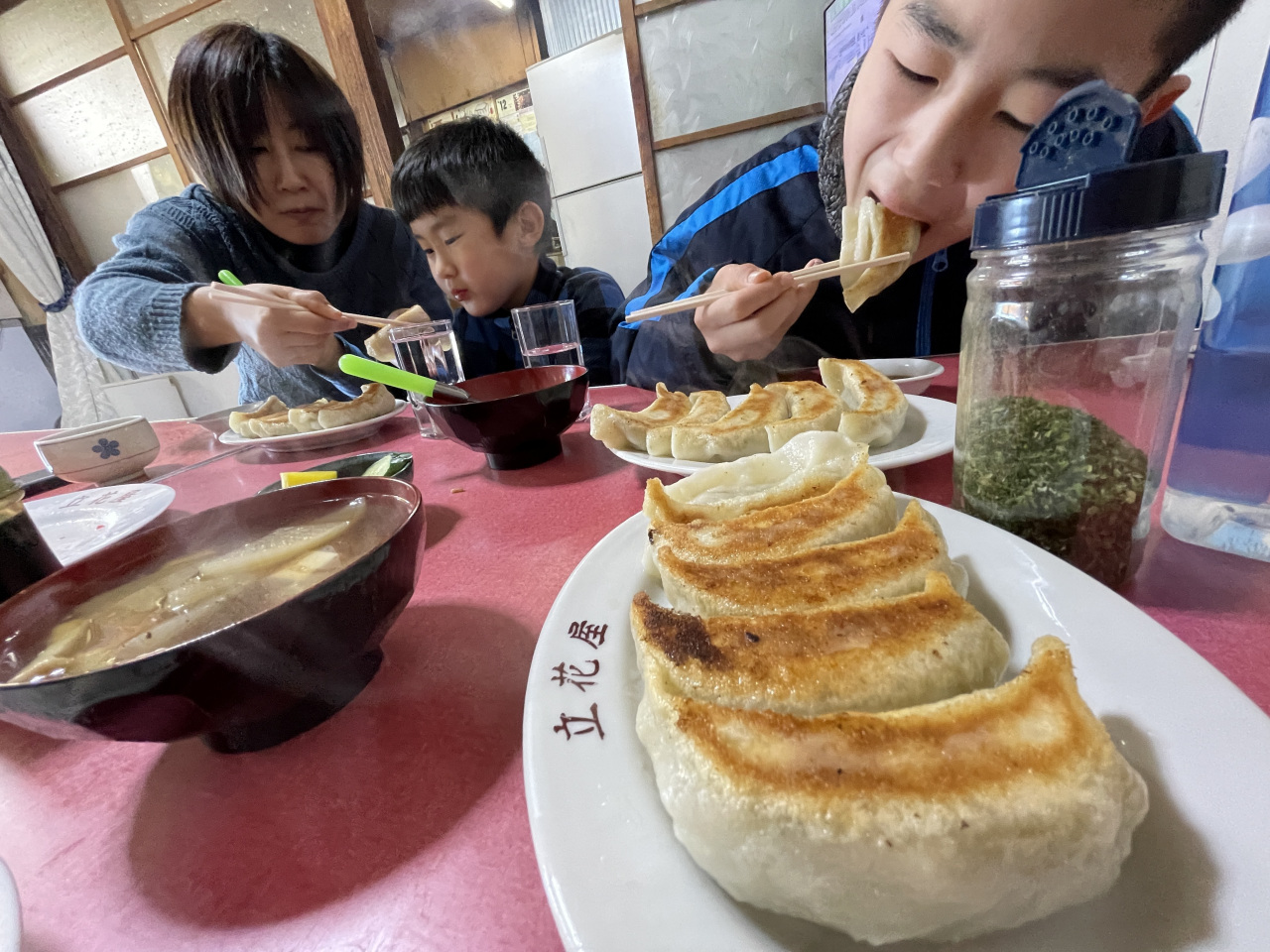目玉焼きの乗った焼きそば大盛1皿、餃子・ライスセット1つ、餃子をさらに2皿頼んで、家族5人腹いっぱいとなったのに、しめて1,800円弱。量も多いし、なによりうまいっ!!!