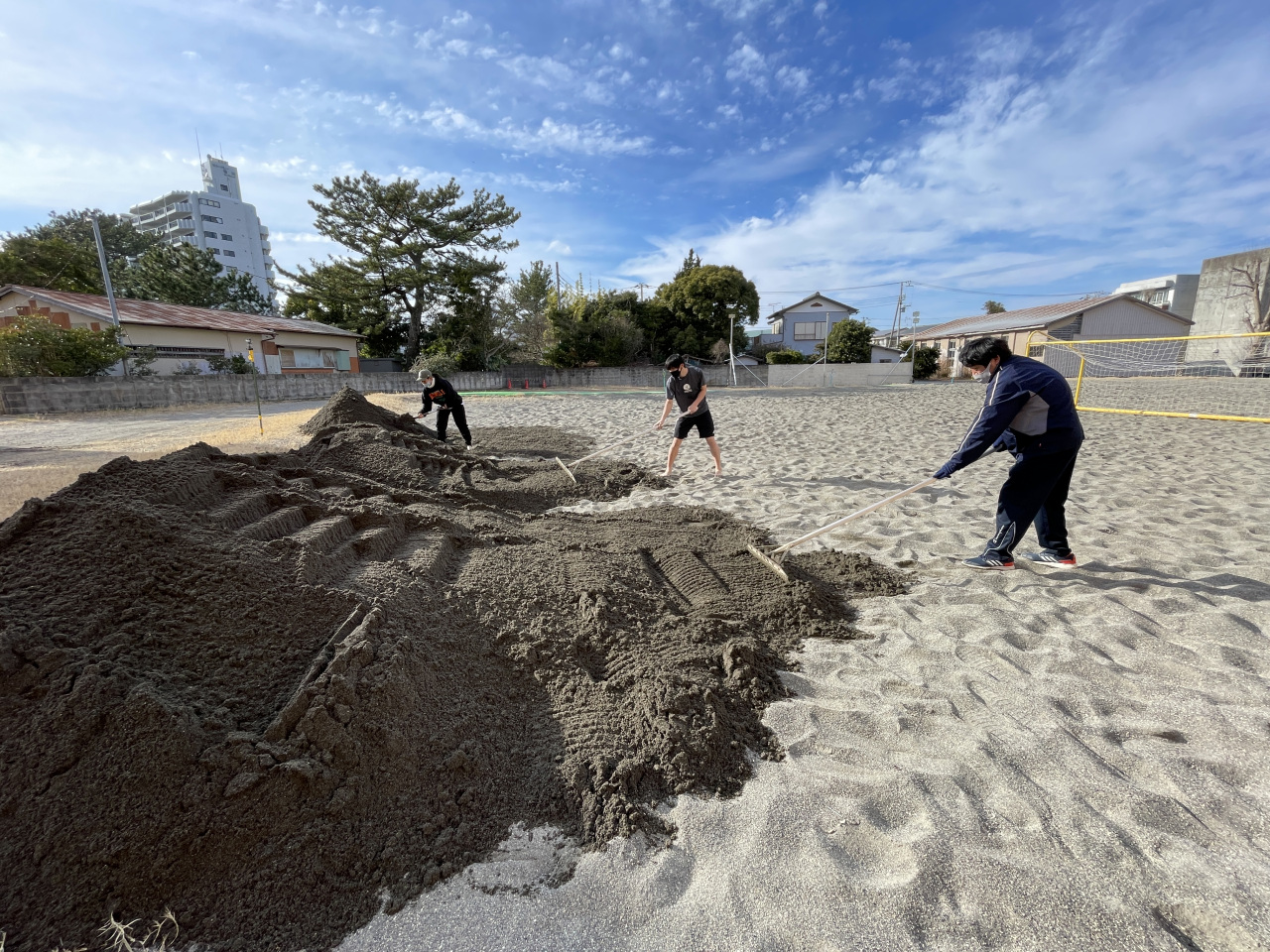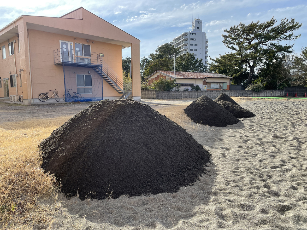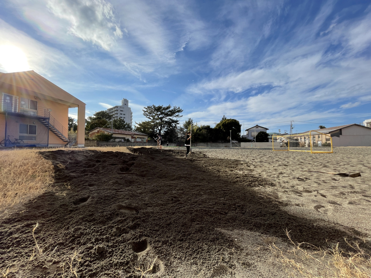 午後、鴨川令徳ビーチコートに念願の砂の補充が入り、集まったメンバーでさっそく均し作業。