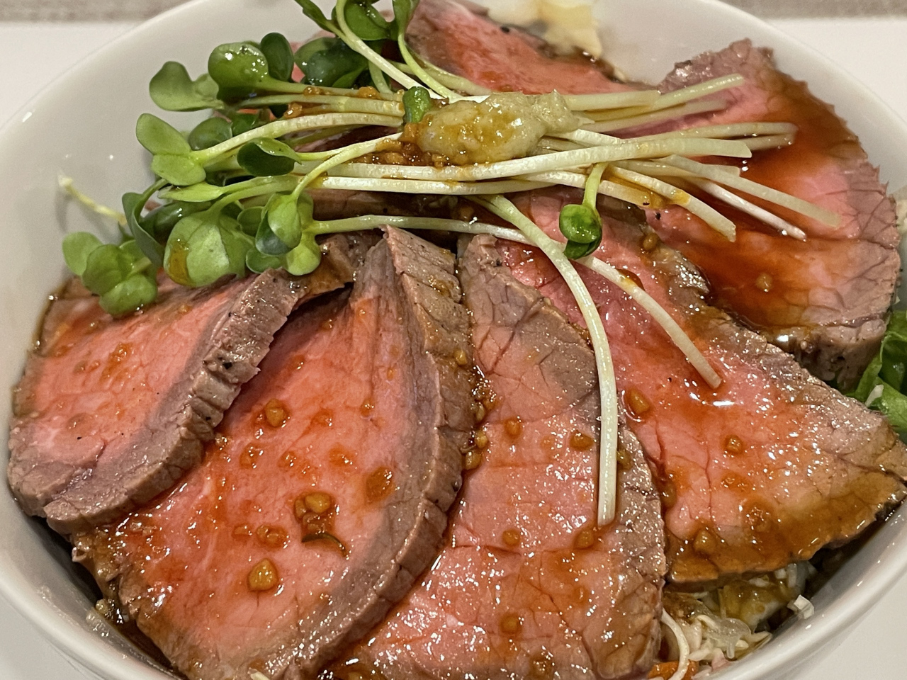 今日はそのままご飯、生野菜の上にのせて、豪華ローストビーフ丼!!