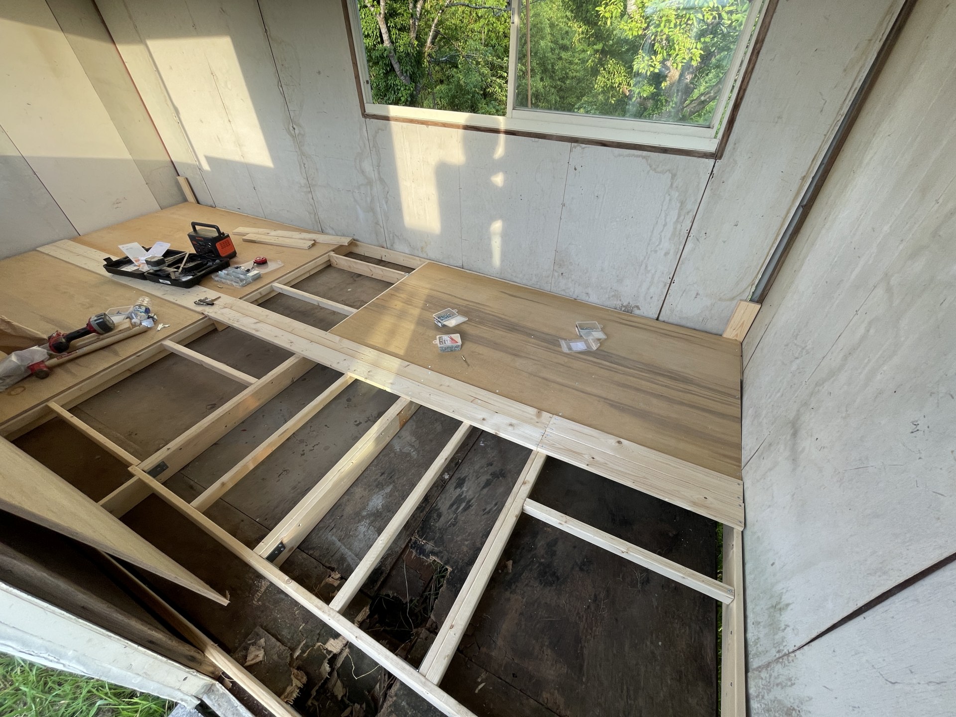 先週、傷みの激しい方に床をつくったのだが、どうも強度に難があるので、一度床をはがして補強することにした。4時間ほどインパクトを打ち続け、、、汗だくのヘトヘト。