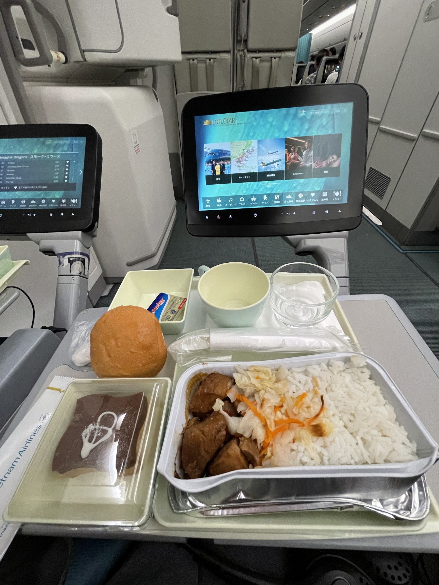 [写真:ベトナム航空でも機内食が!足元の広い席で快適♪