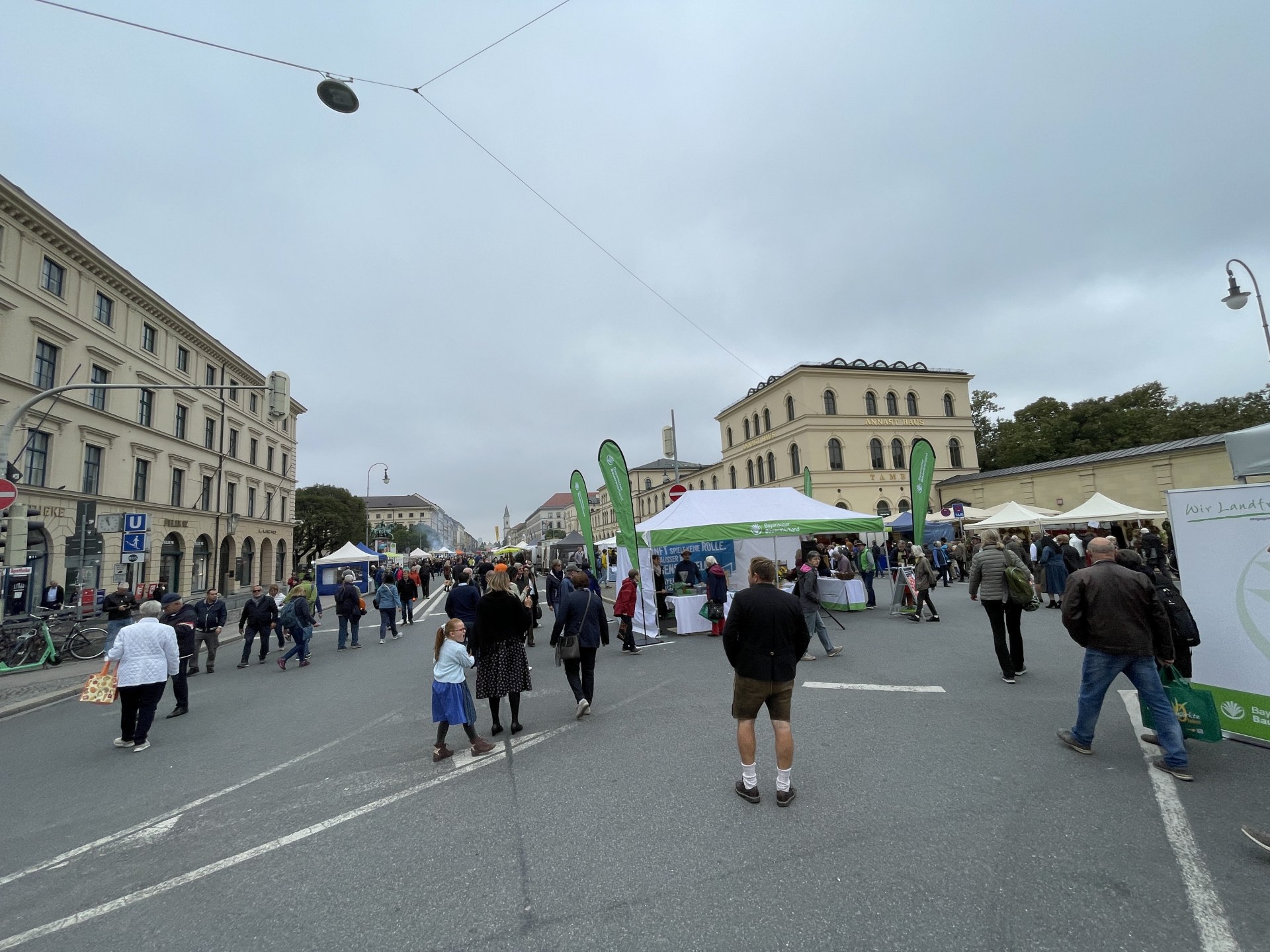 マリエン広場から北方へ地下鉄1駅分歩いてみると、「Odeonsplatz」駅周辺の広場ではちょうど日曜マーケットが行われていて、多くの人たちでにぎわっていた。おいしそうな肉料理やソーセージを頬張りながら、昼間からビールを飲む。さすがだ!!笑
