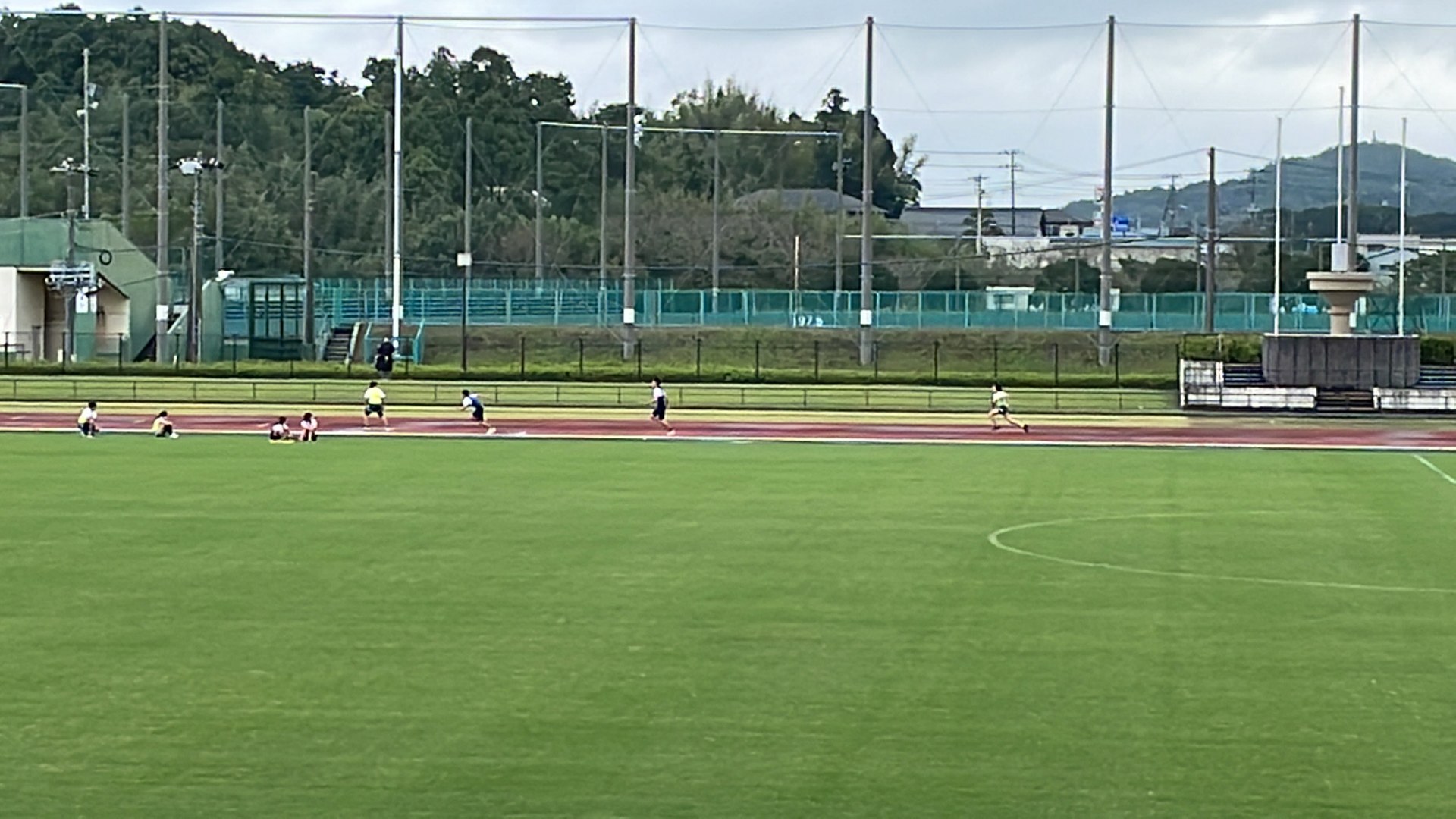 まずは100m走。好記録が期待されたが、雨上がりのタータンに足を滑らせたのか、序盤失速。そこから追い上げるも本人としては納得のいかない記録だったようだ。(たぶん13秒台後半)
