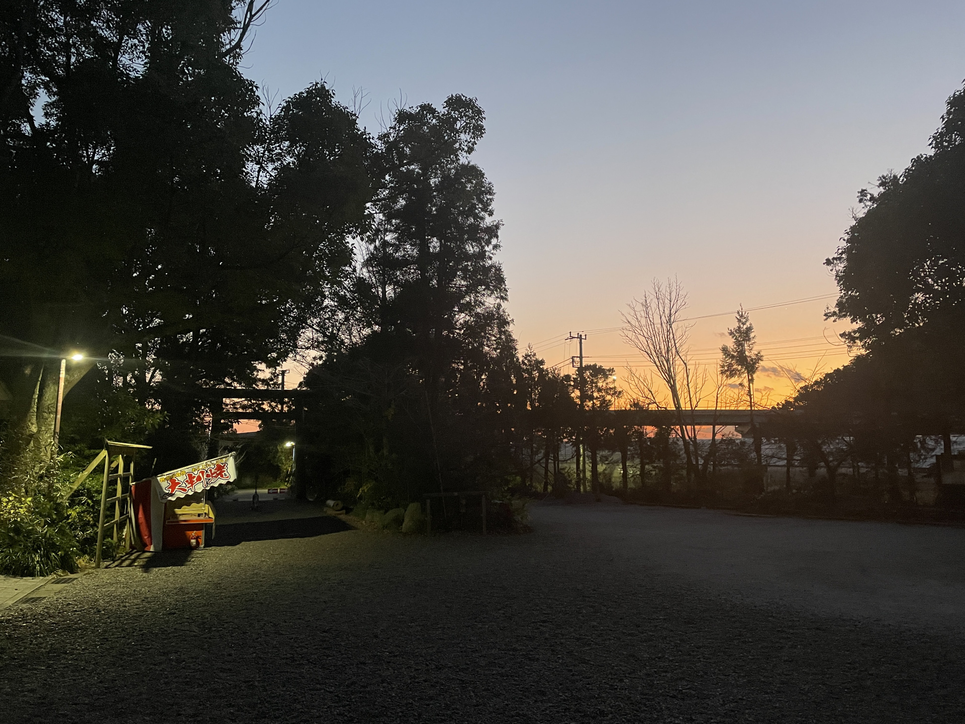 一日のご奉仕を終え、午後5時の閉殿後、参道を下りて夕空を眺めると、なんとも幻想的な光景が広がっていた。