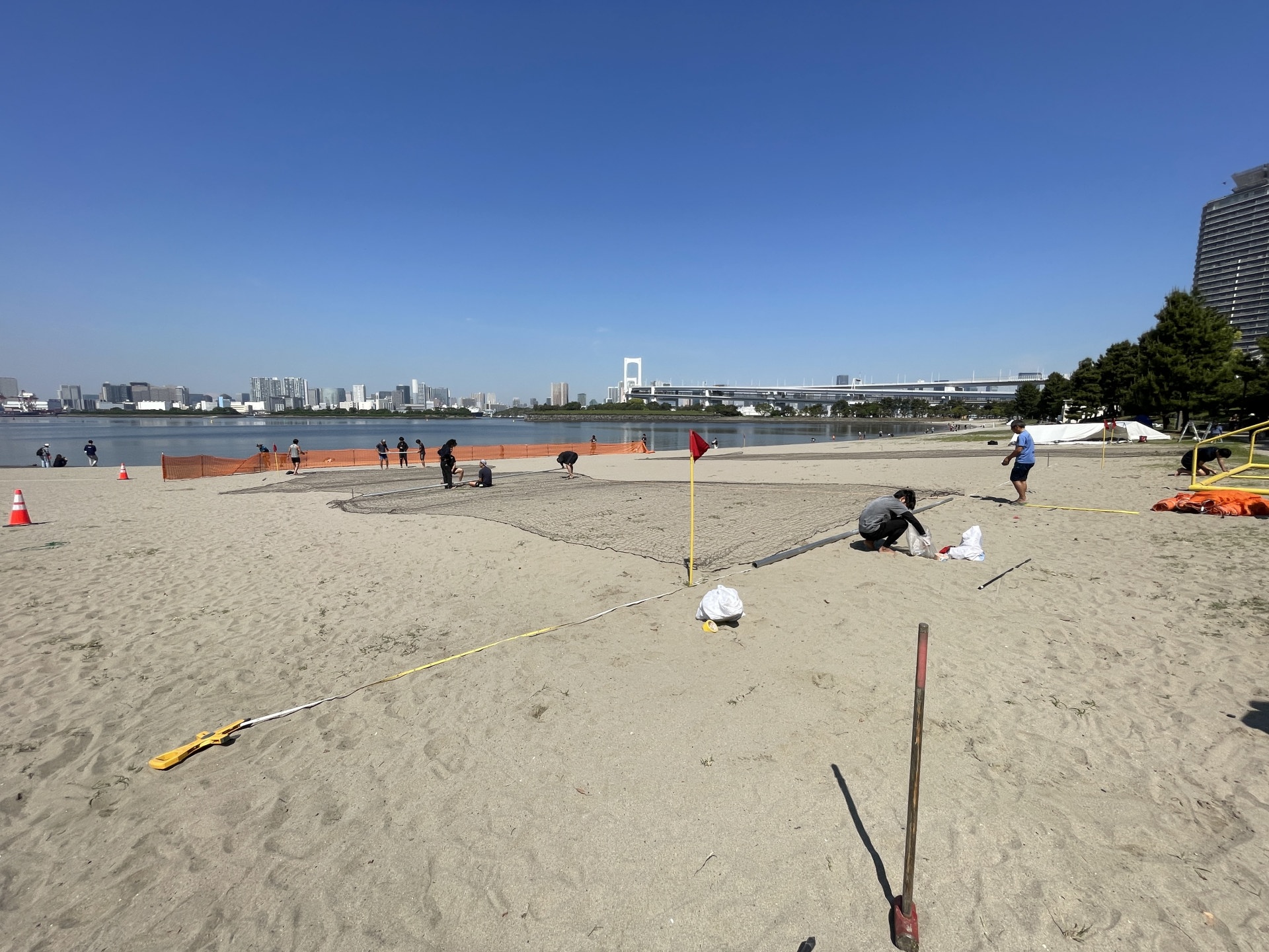 20人近くのメンバーが集まり、3時間ほどかけて、防球ネット、ゴール、ラインテープを準備し、ビーチコートの設営を行った。