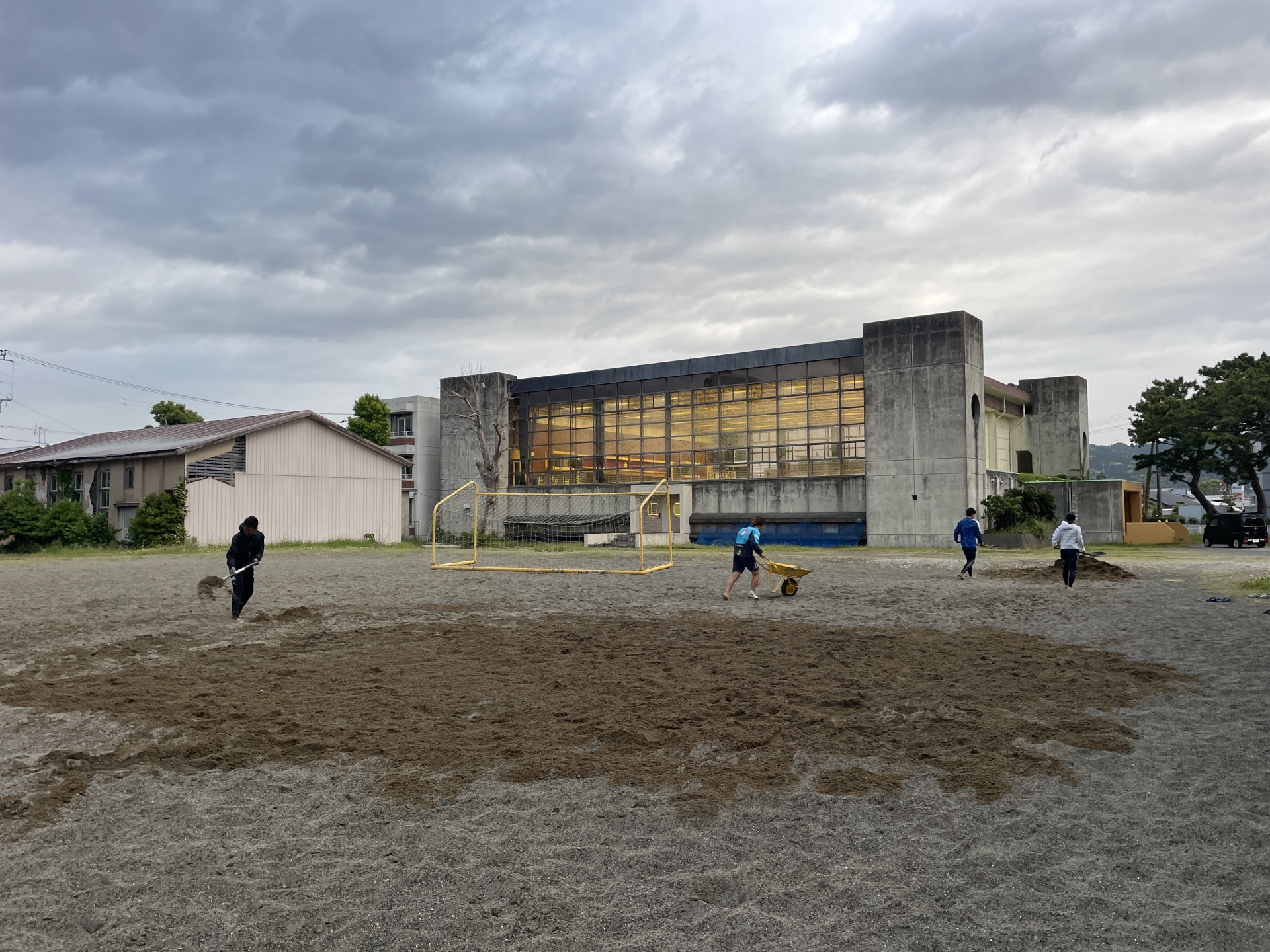今日は3tの砂をダンプで搬入してもらい、メンバーで一輪車で運んで薄くなった部分に足していくという地道な作業。