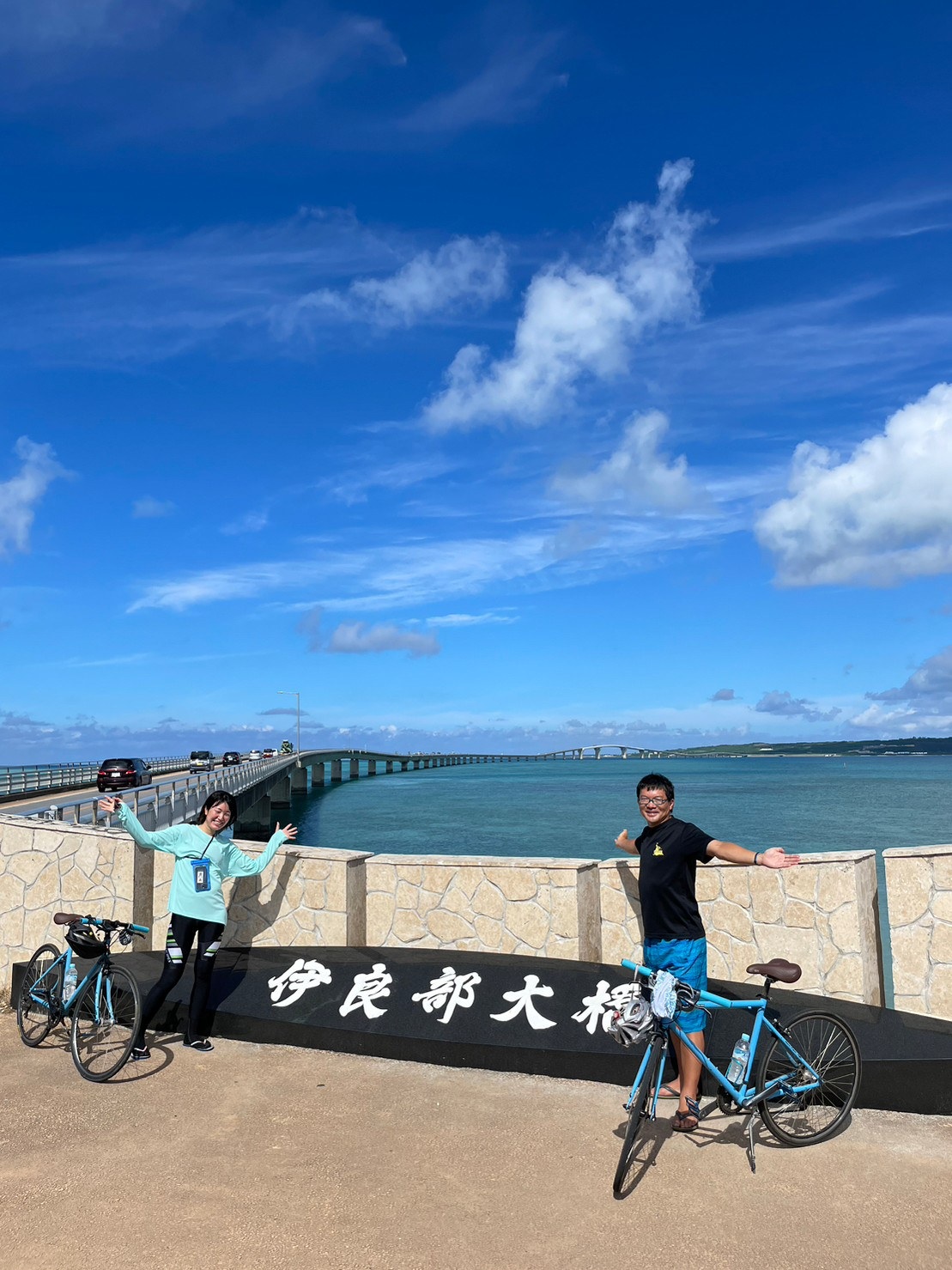 ヒラとりなは、全長3.5kmを超えるダイナミックな伊良部大橋のサイクリングを楽しんだようす。