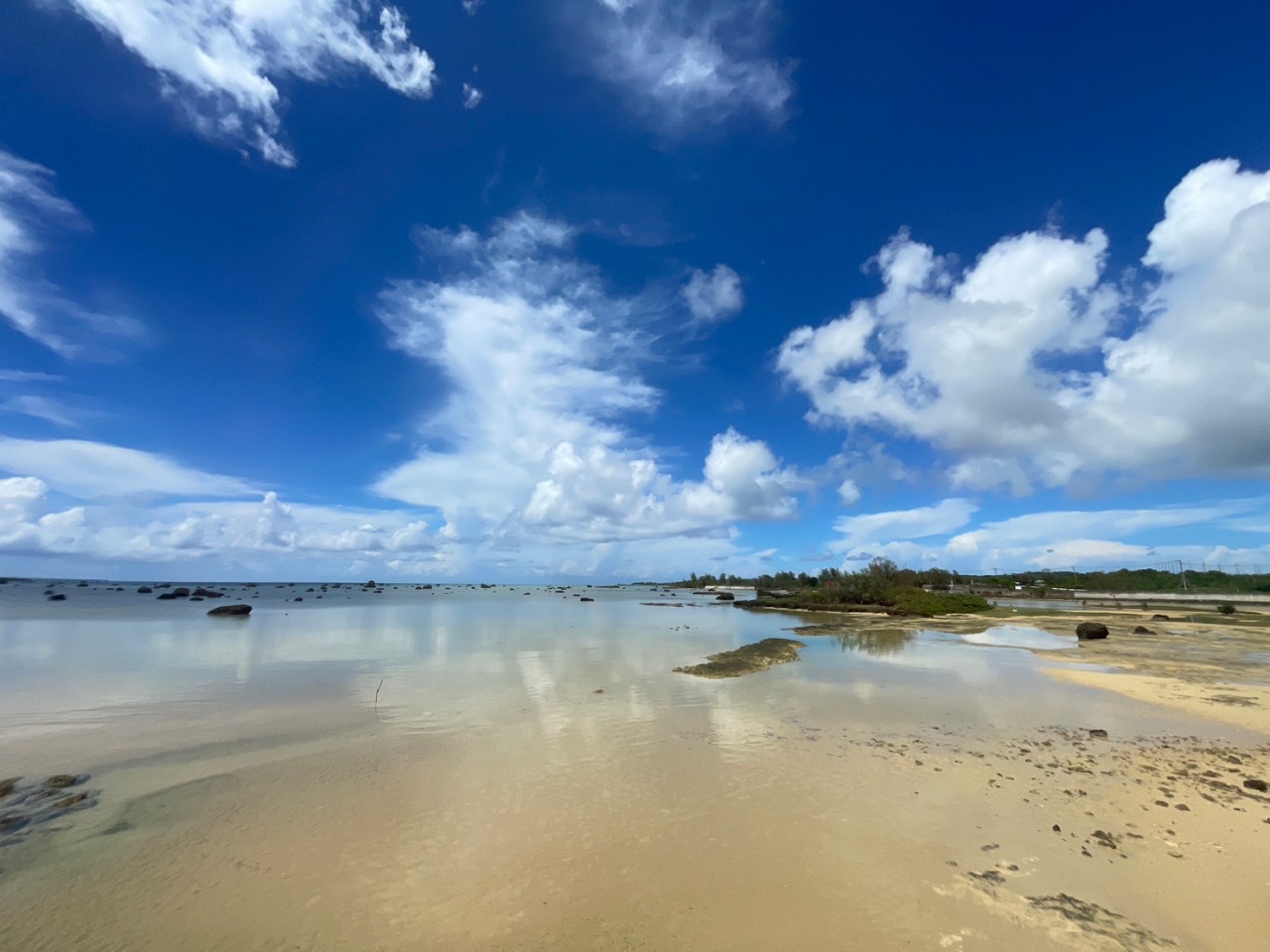 [写真:マングローブの群生も見られる佐和田の浜。まるで鏡のよう