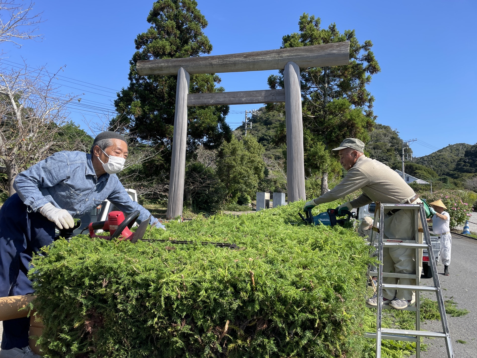 [写真:責任役員さんと一ノ鳥居の生け垣を刈り込み