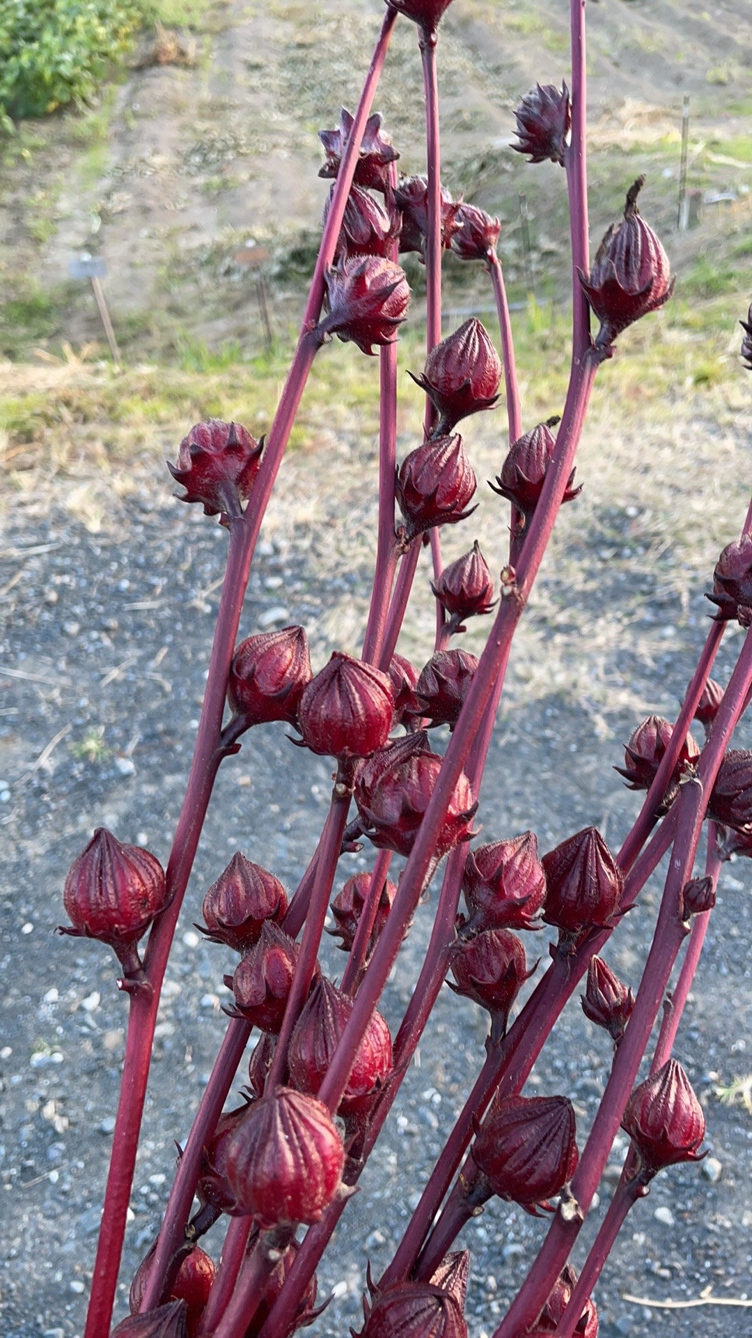 [写真:ハイビスカス・ローゼル、いただきました。お茶とかジャムに加工できるらしい。