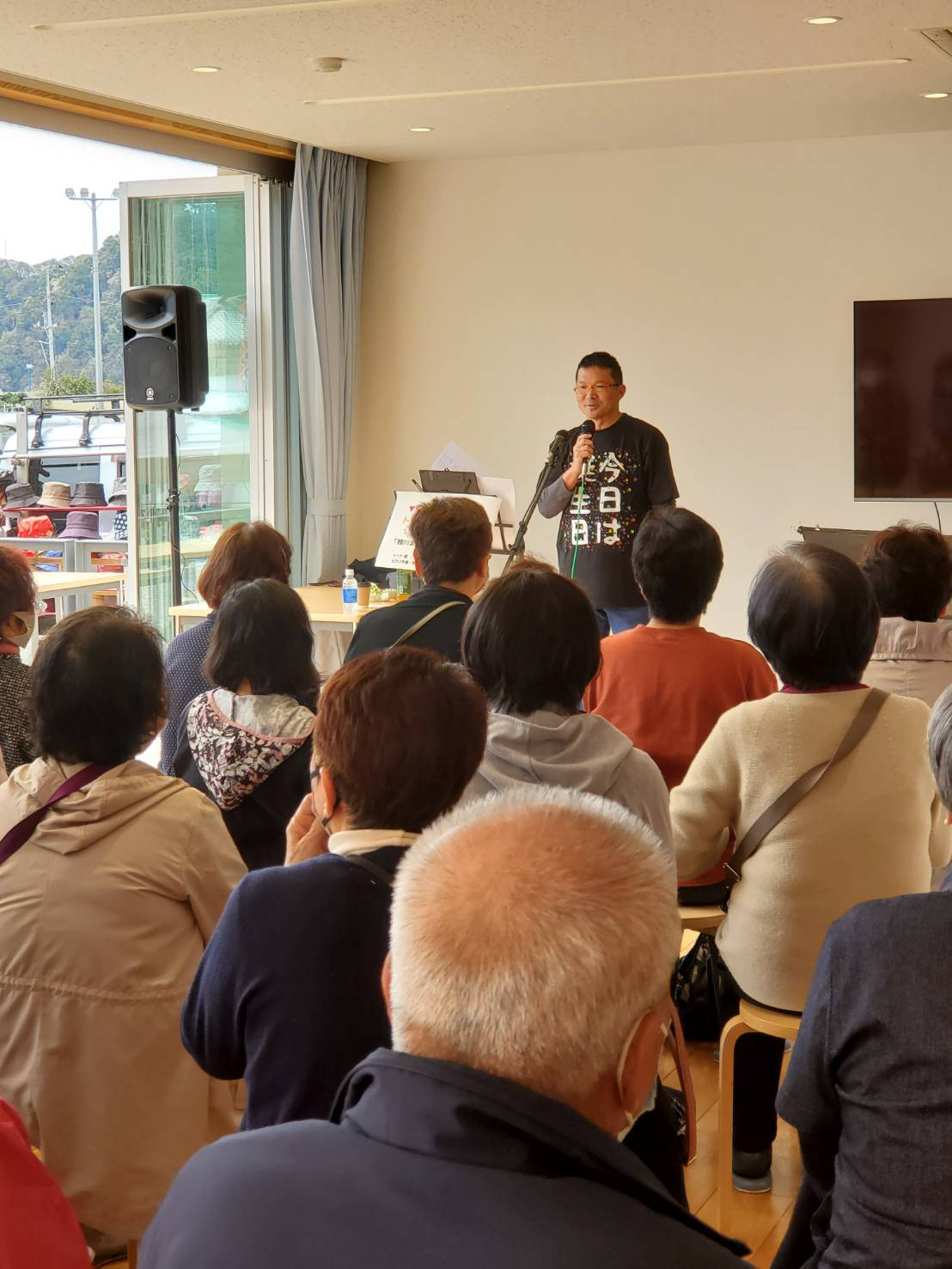 そんな節目の日に、小湊さとうみ学校で毎月11日開催されている「さとうみ11マルシェ」にお邪魔して、トーク&ソングライブをお昼の時間を使って、1時間ばかり開かせていただいた。