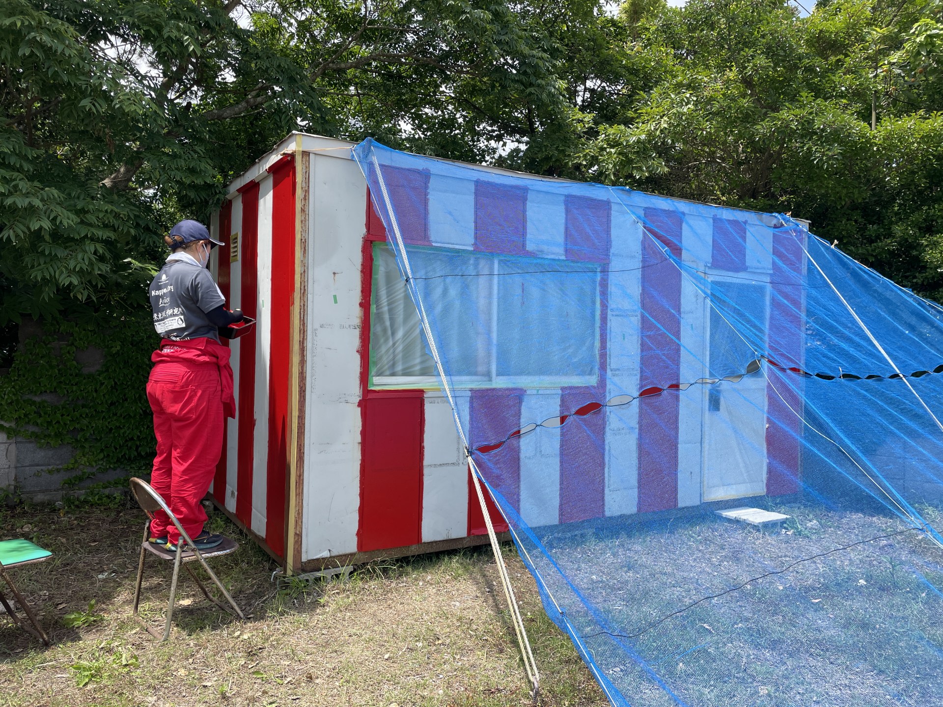 今日は朝からヨンちゃんと、鴨川令徳ビーチコート脇に新たに設置した倉庫の塗装を行った。