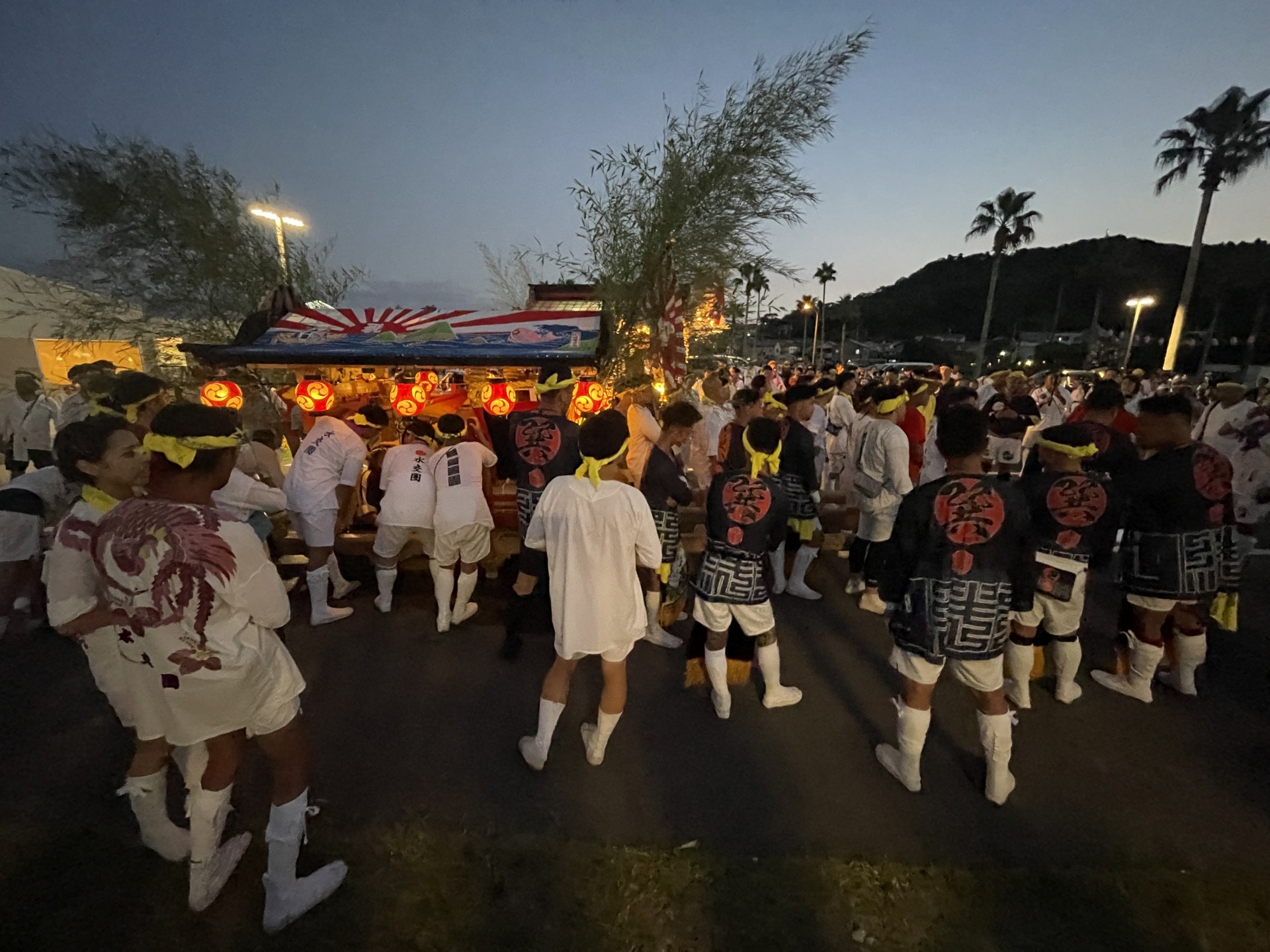 [写真:打ち上げに行ったKAMOGAWA SEASIDE BASEではちょうど担ぎ屋台が担ぎ出されるところに遭遇