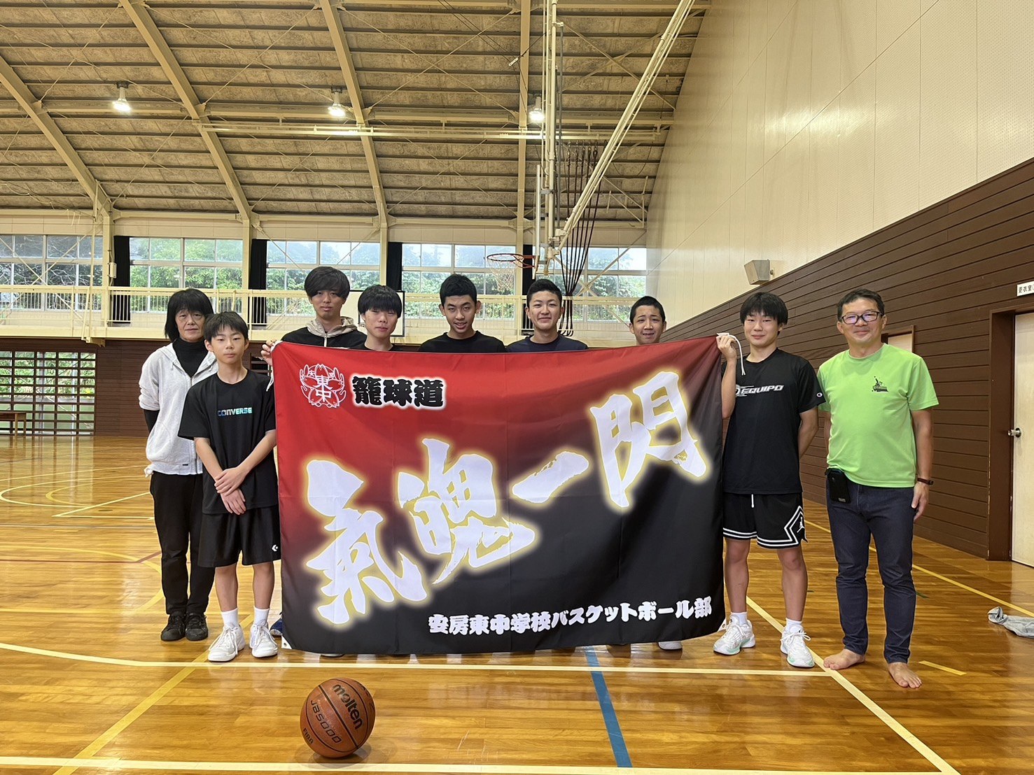 [写真:我々からバスケ部へ応援旗のプレゼント!